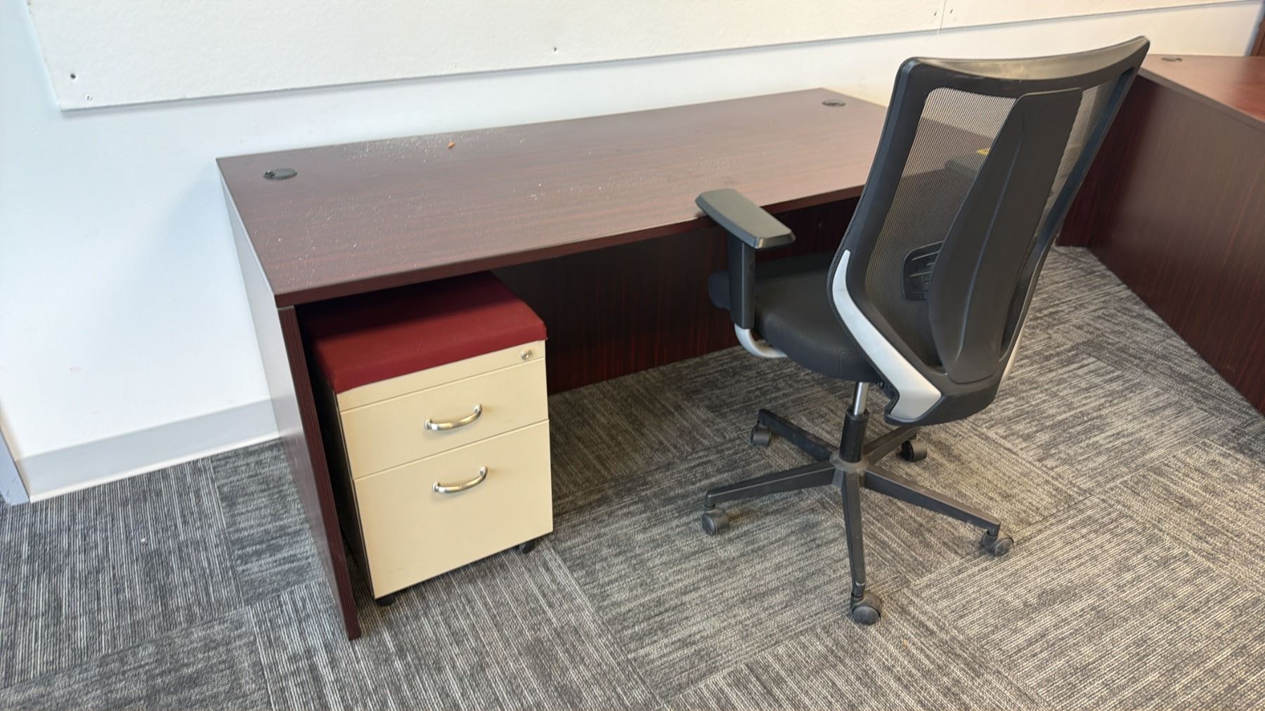 WOOD DESK WITH MESH BACK ROLLING OFFICE CHAIR & FILE CABINET