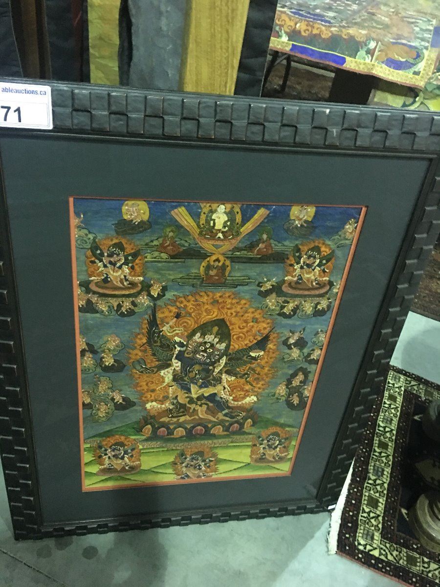WOOD FRAMED HAND PAINTED ON CANVAS EASTERN CULTURE DEITY APPROX 3FT X 2.5FT