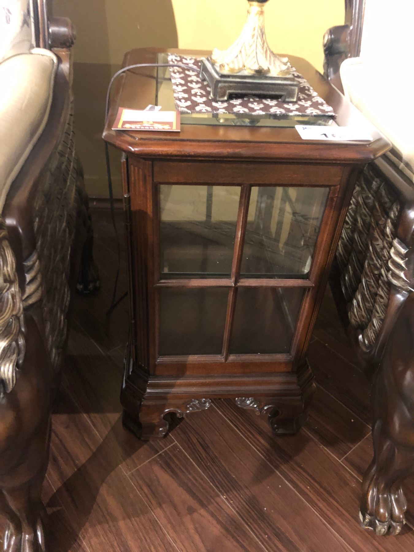 WOOD / GLASS SIDE CABINET. RETAIL $1,150.00