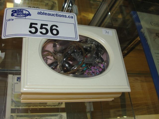 WOOD JEWELLERY BOX FILLED WITH MISC JEWELLERY CONTENT