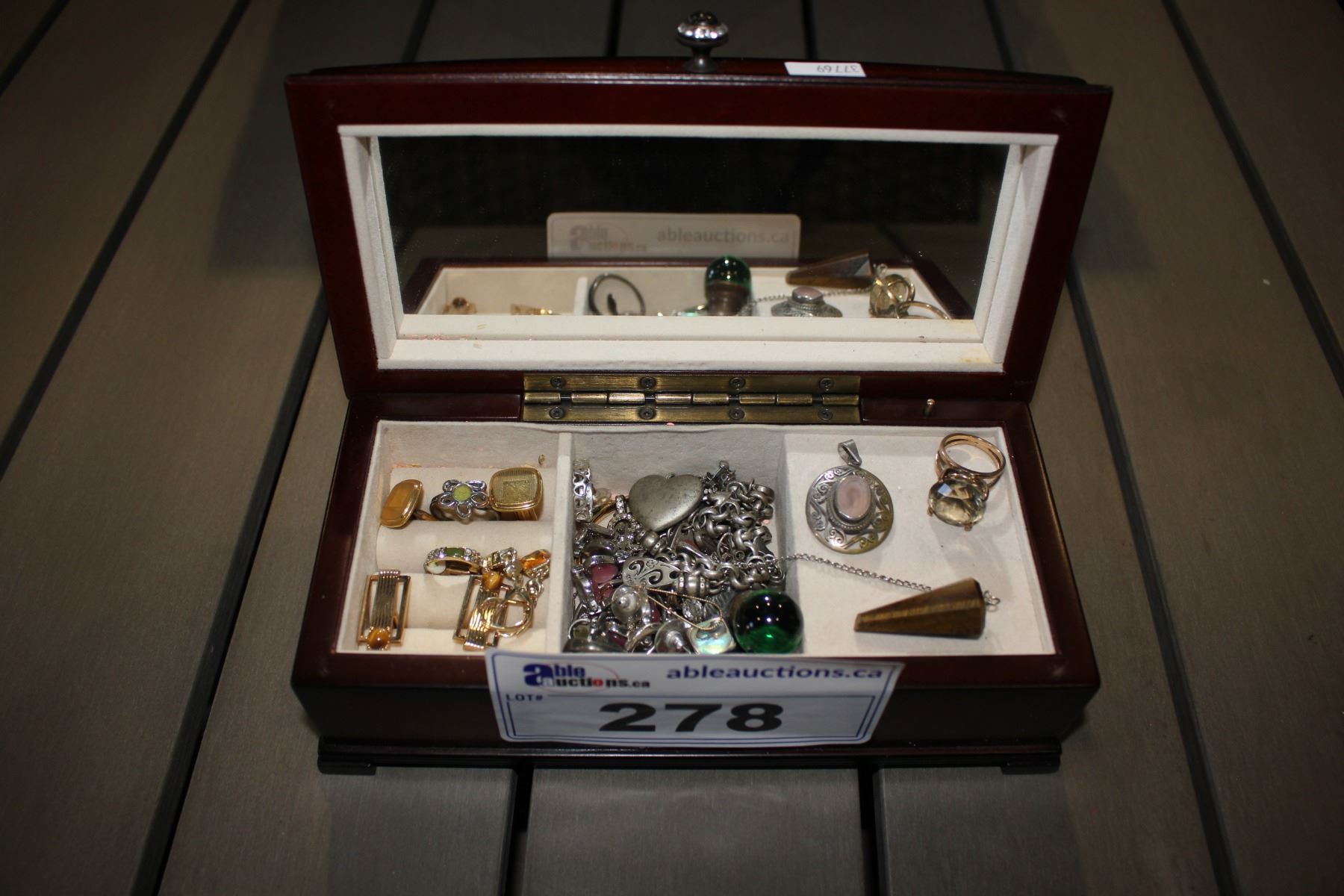 WOOD JEWELRY BOX WITH CONTENTS
