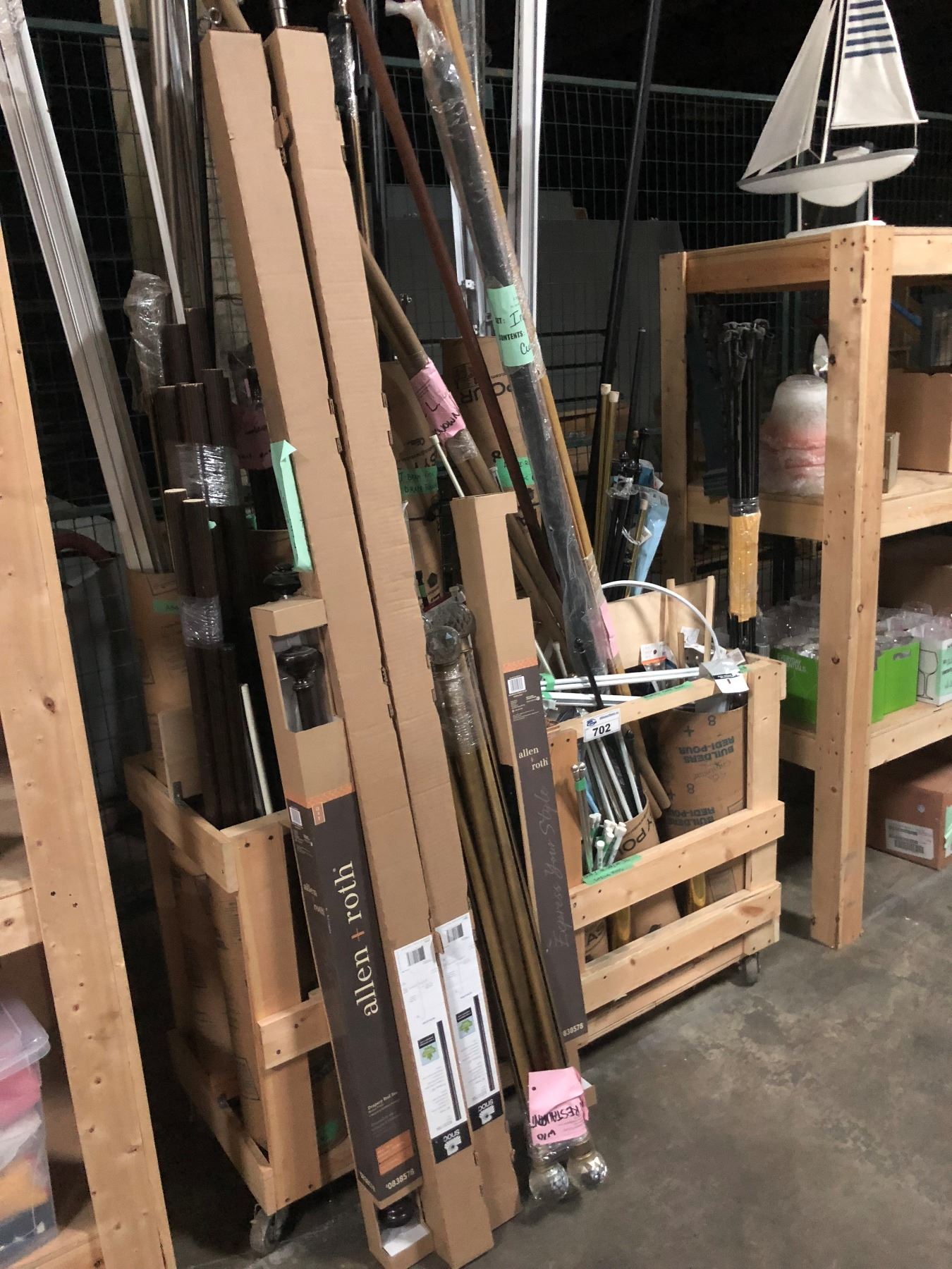 WOOD RACK WITH ASSORTED DRAPERY RODS & MORE