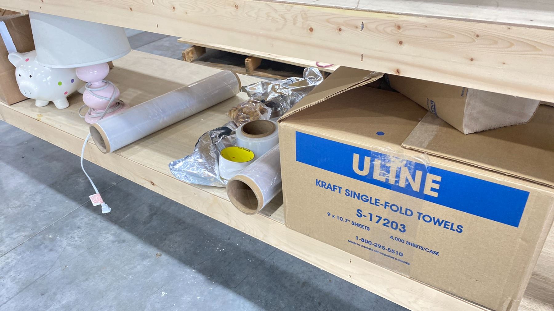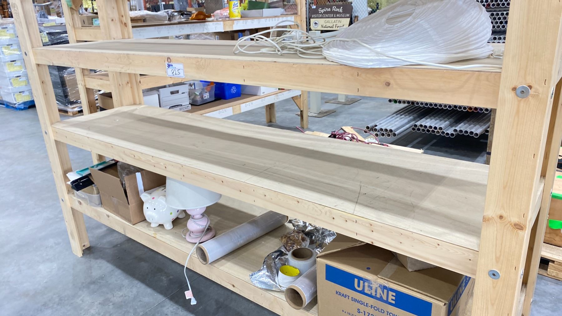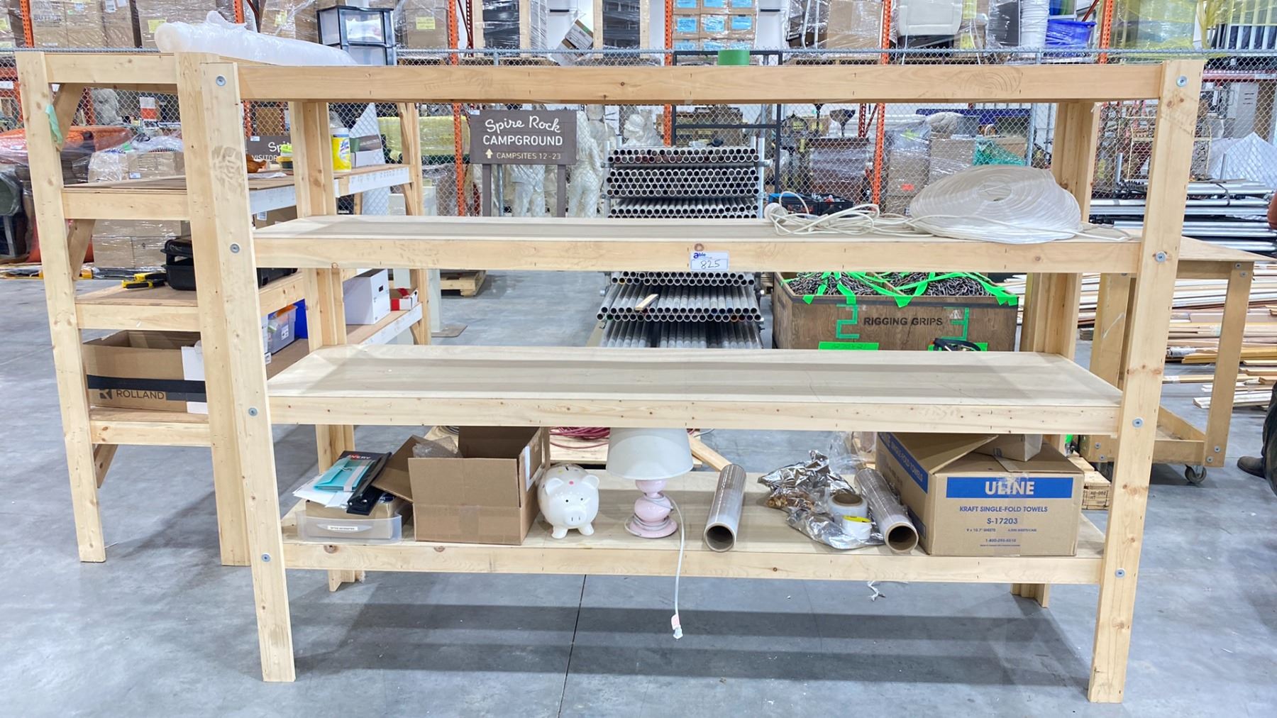 WOOD RACK WITH ASSORTED SHOW PROP CONTENTS (RACK INCLUDED & MUST BE TAKEN)