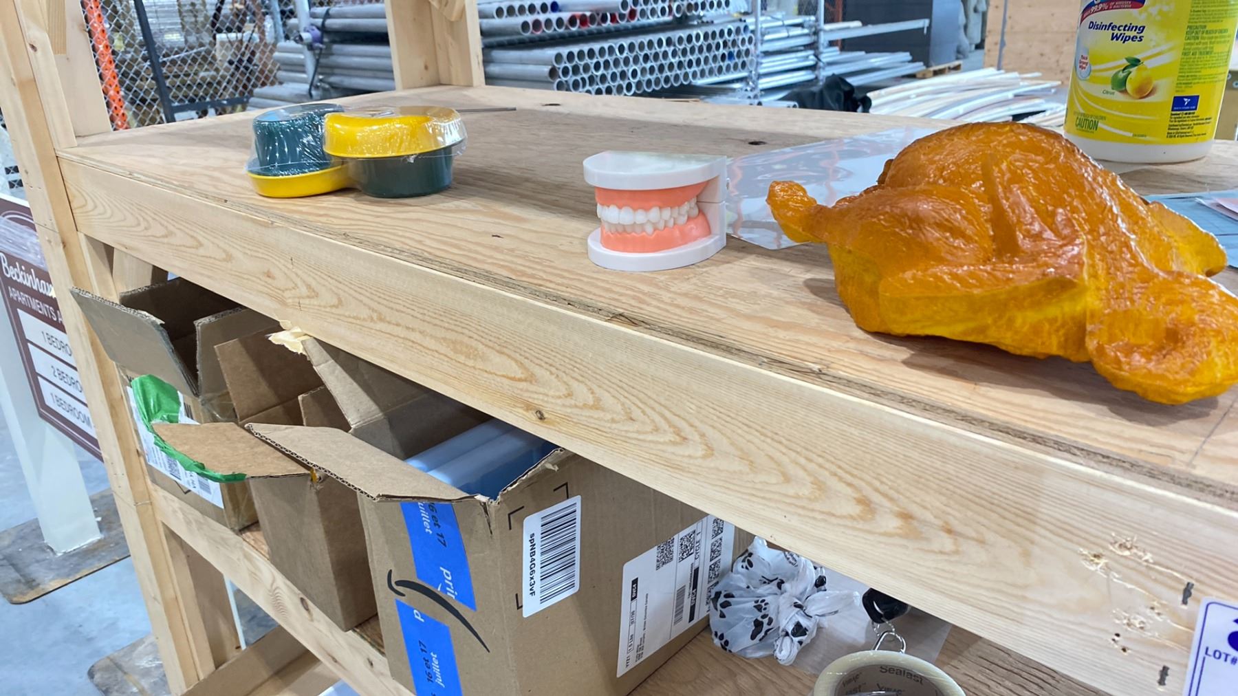 WOOD RACK WITH ASSORTED SHOW PROP CONTENTS (RACK INCLUDED & MUST BE TAKEN)