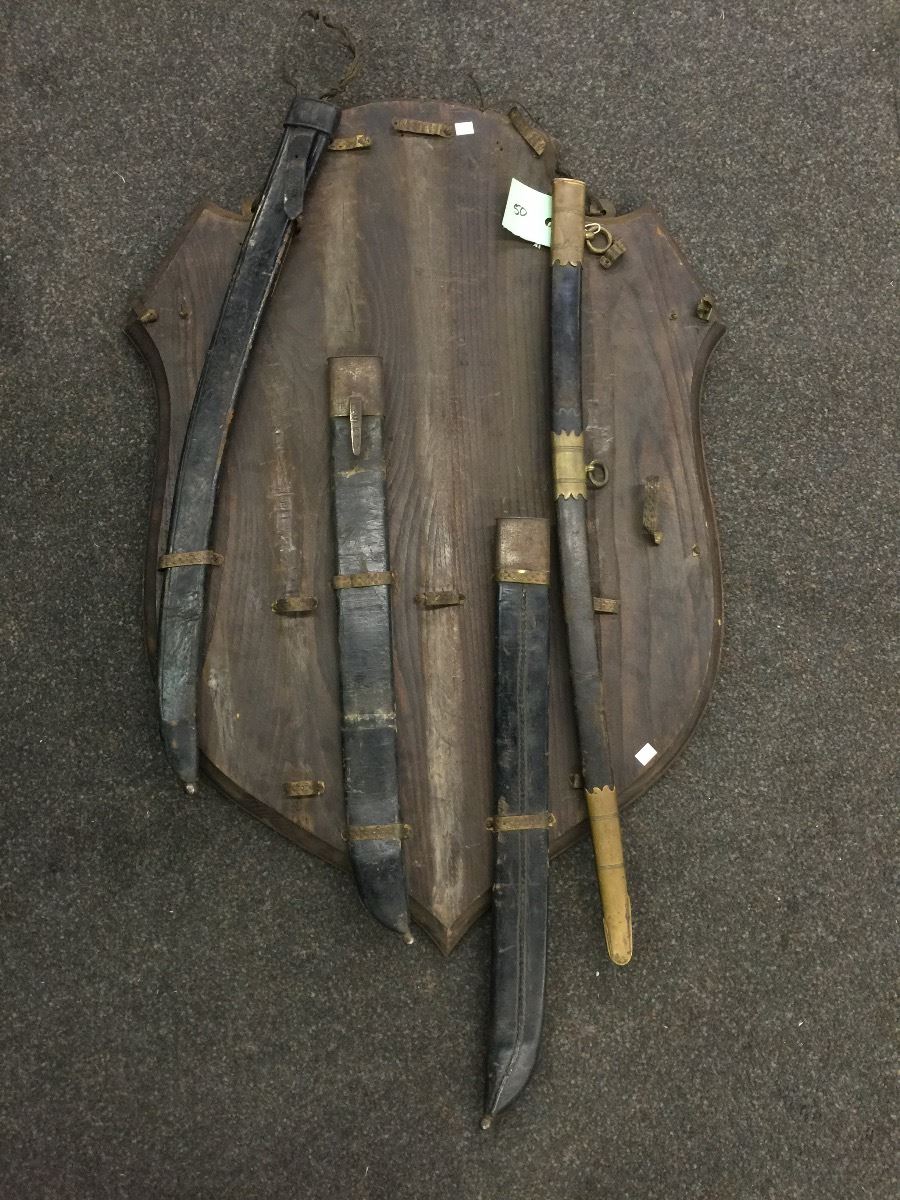 WOOD SHEILD (POOR CONDITION) WITH ASSORTED SWORDS AND SCABBARDS