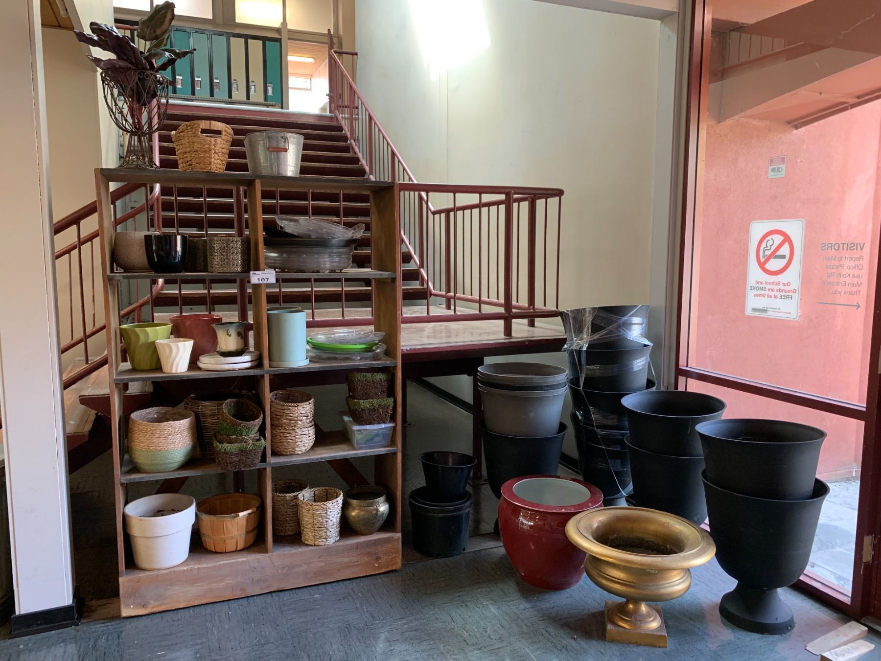 WOOD SHELVING UNIT & LARGE ASSORTMENT OF PLANTER POTS