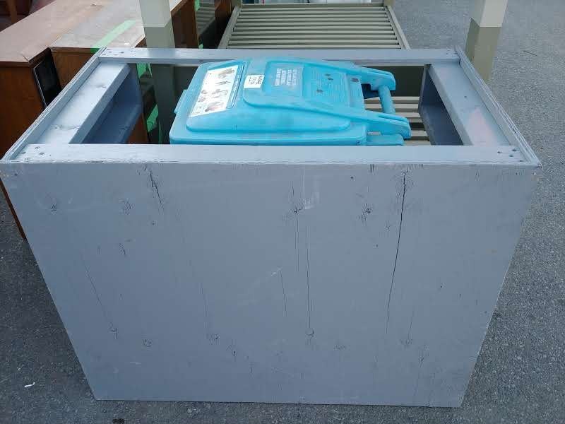 WOOD TABLE WITH BLUE RECYCLING BIN