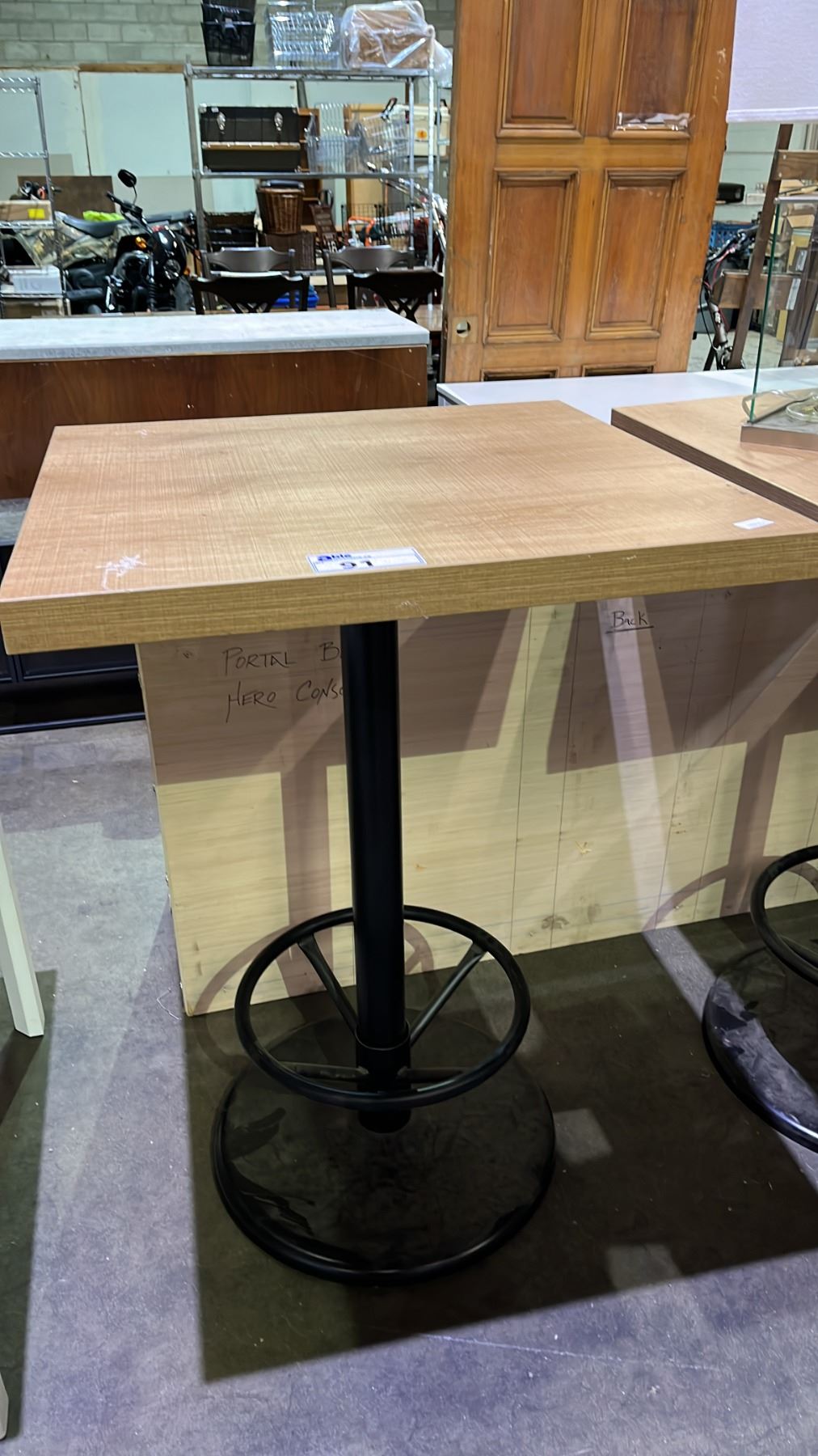 WOOD WITH METAL BASE BAR TABLE 30" X 30" X 43" (SOME COSMETIC TOP DAMAGE)