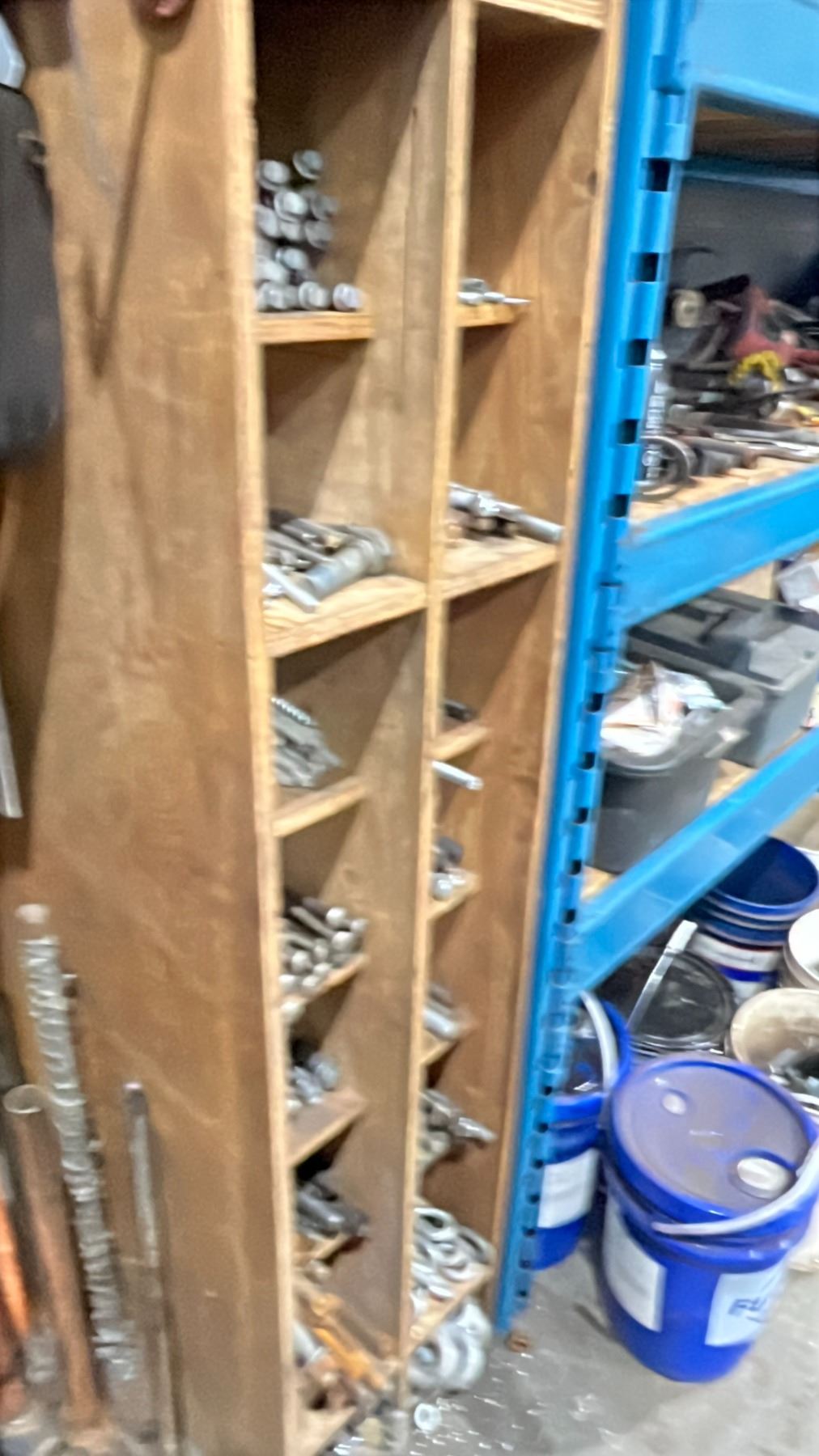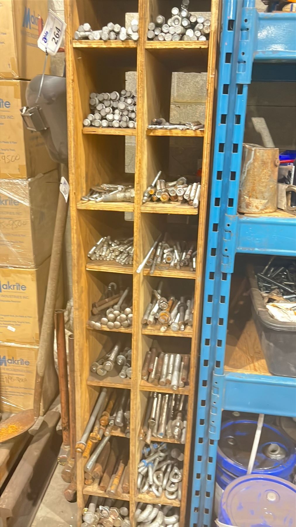 WOODEN 18 COMPARTMENT HARDWARE STORAGE UNIT WITH CONTENTS