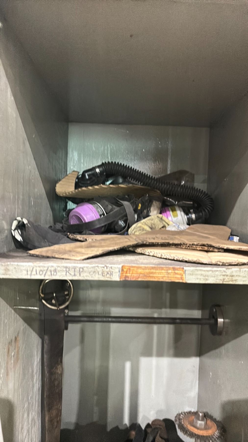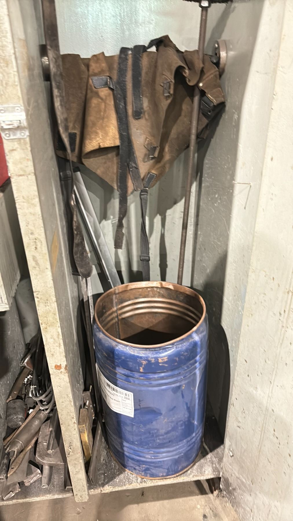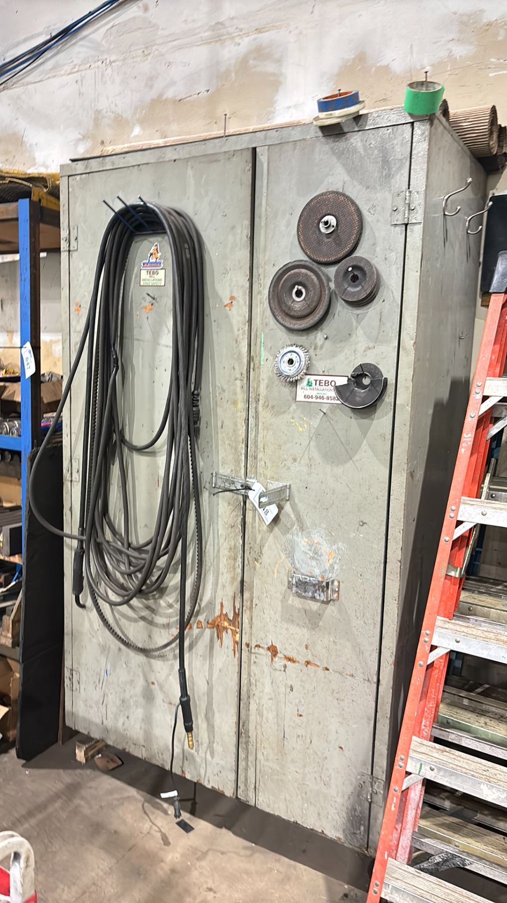 WOODEN 2 DOOR WORK CABINET & CONTENTS - ASSORTED MISCELLANEOUS WELDING & GRINDING ACCESSORIES APPROX. 4'W X 2'D X 7'H