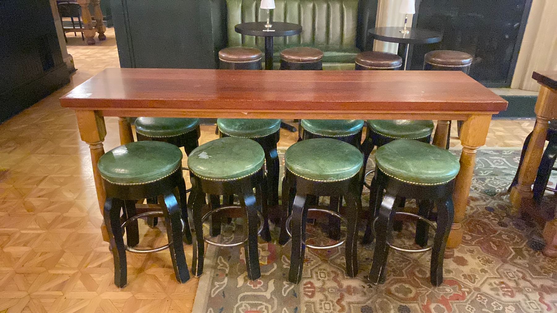 WOODEN 78"W X 21"D X 36"H BAR TABLE WITH 8 DARK WOOD GREEN LEATHER TOP STUDDED BAR STOOLS