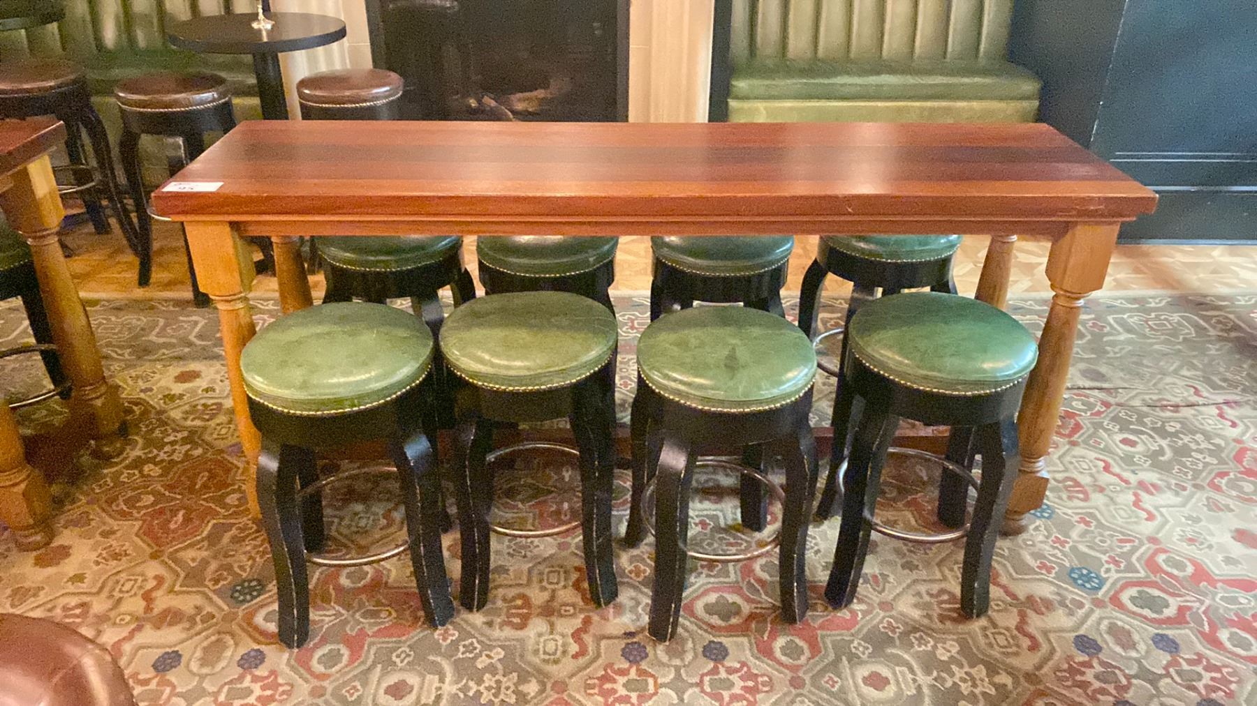 WOODEN 78 W X 21 D X 36 H BAR TABLE WITH 8 DARK WOOD GREEN LEATHER TOP STUDDED BAR STOOLS