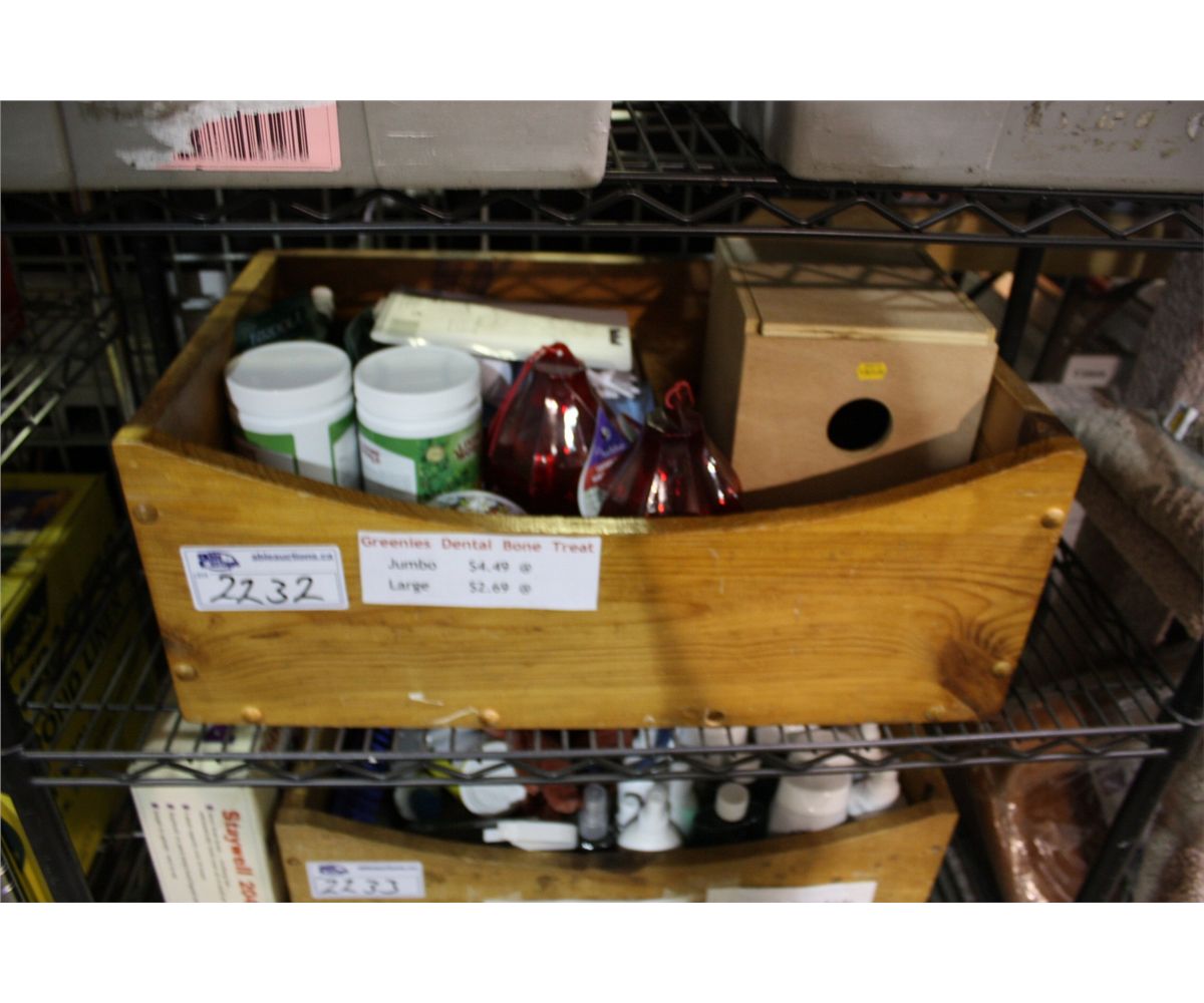 WOODEN BIN OF ASSORTED PET STORE PRODUCT