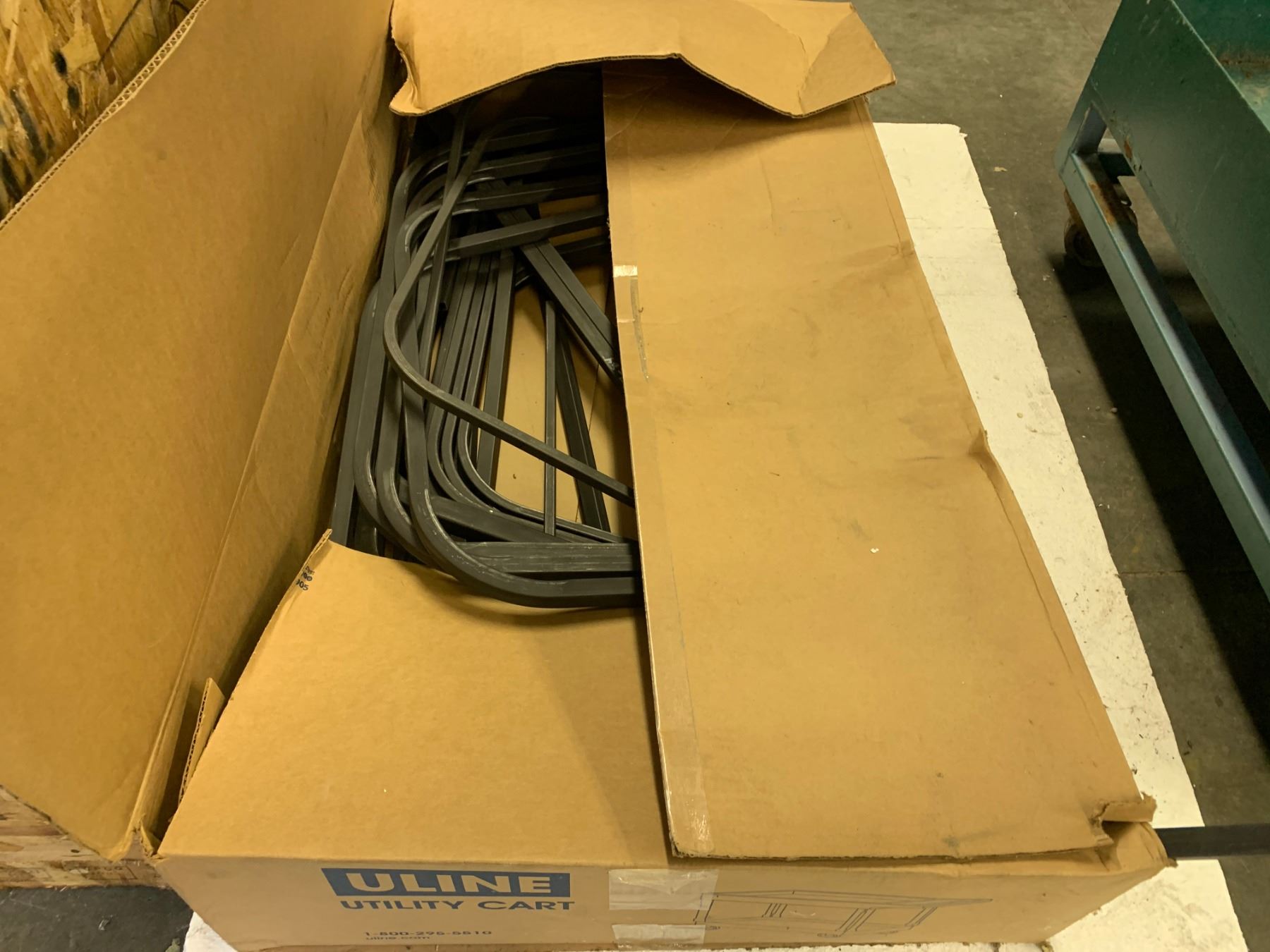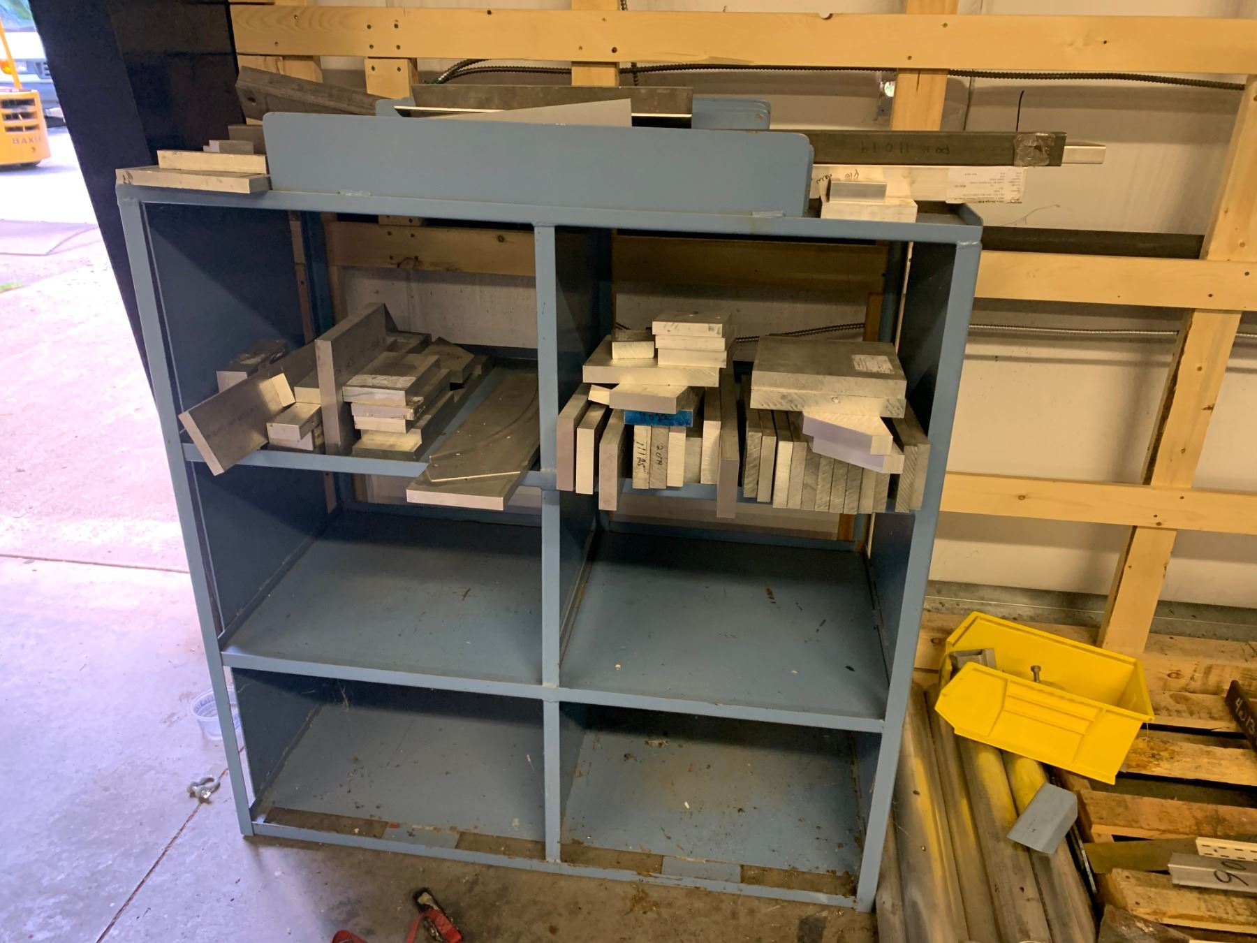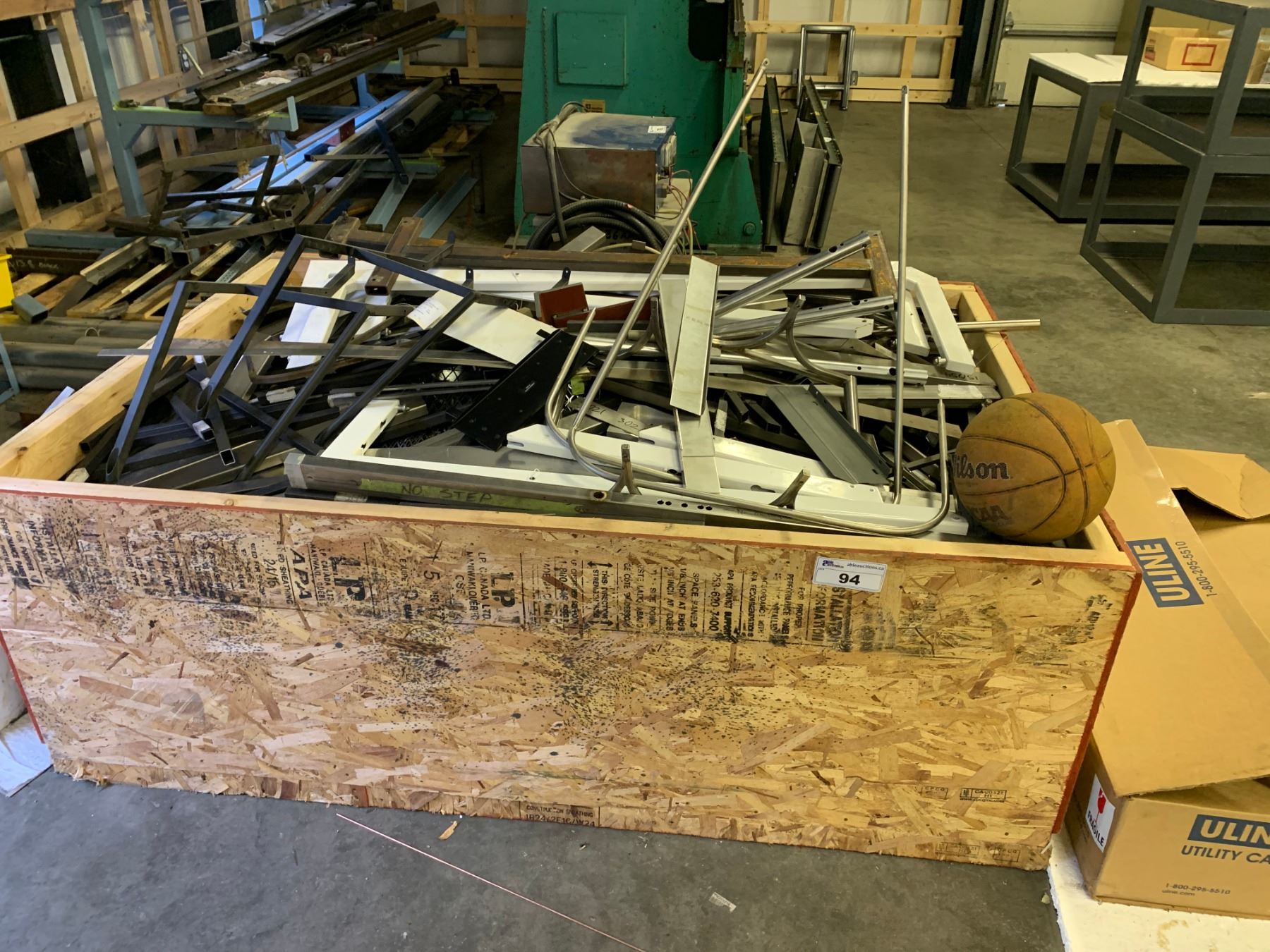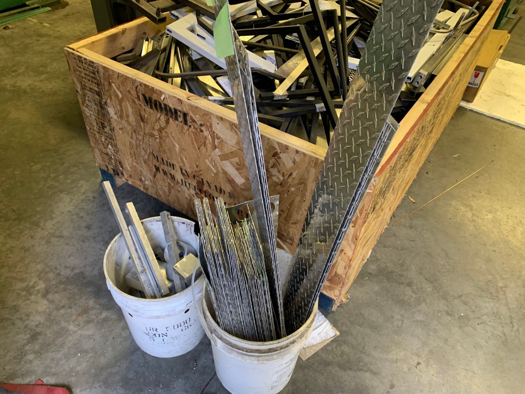 WOODEN BIN OF ASSORTED SHORT STEEL STOCK, 2 BINS OF ALUMINUM CHECKERED PLATES, ULINE BOX OF METAL SCRAPS & BLUE RACK WITH 6061 - T6 DENSIT ALUMINUM CUT OFFS