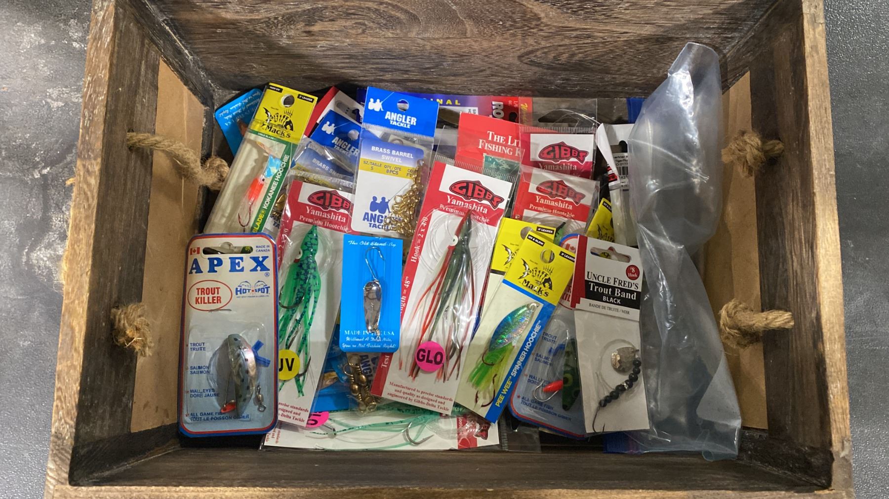 WOODEN BOX OF ASSORTED NEW RETAIL FISHING HOOKS, SPINNERS, BOBS, & PACKAGED TACKLE ITEMS *BOX INCLUDED*