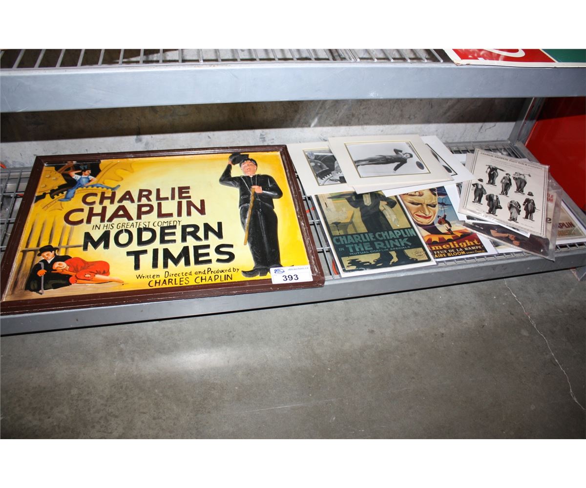 WOODEN CHARLIE CHAPLIN DECORATIVE SIGN AND LARGE LOT OF CHARLIE CHAPLIN MEMORABILIA, POSTERS, MAGAZINES, ETC