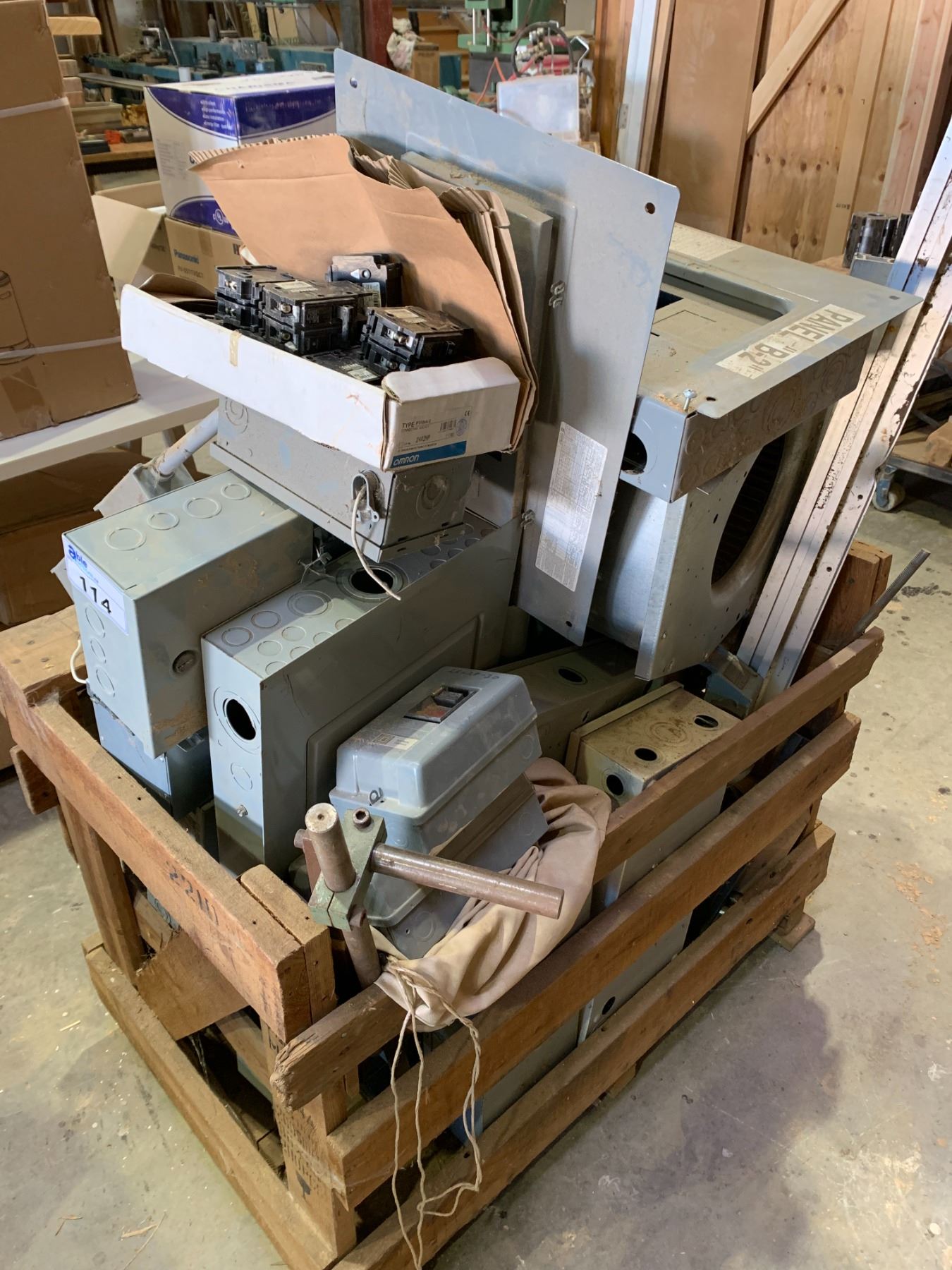 WOODEN CRATE FILLED WITH ELECTRICAL BREAKERS & BREAKER BOXES
