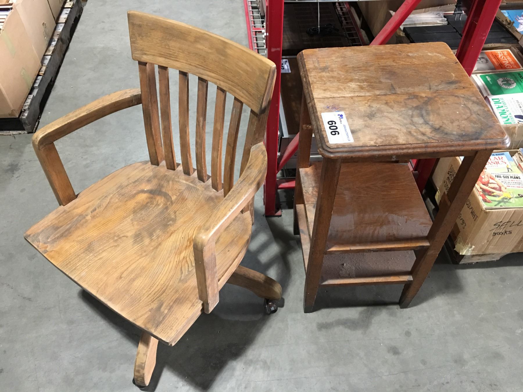 WOODEN OFFICE CHAIR & SMALL 3 TIER OAK SIDE TABLE