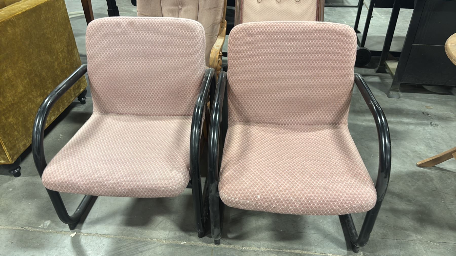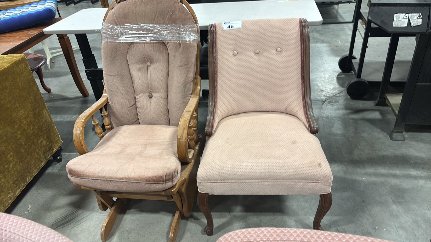 WOODEN ROCKING CHAIR, VINTAGE BUTTON BACK CHAIR & TWO MATCHING CLIENT CHAIRS