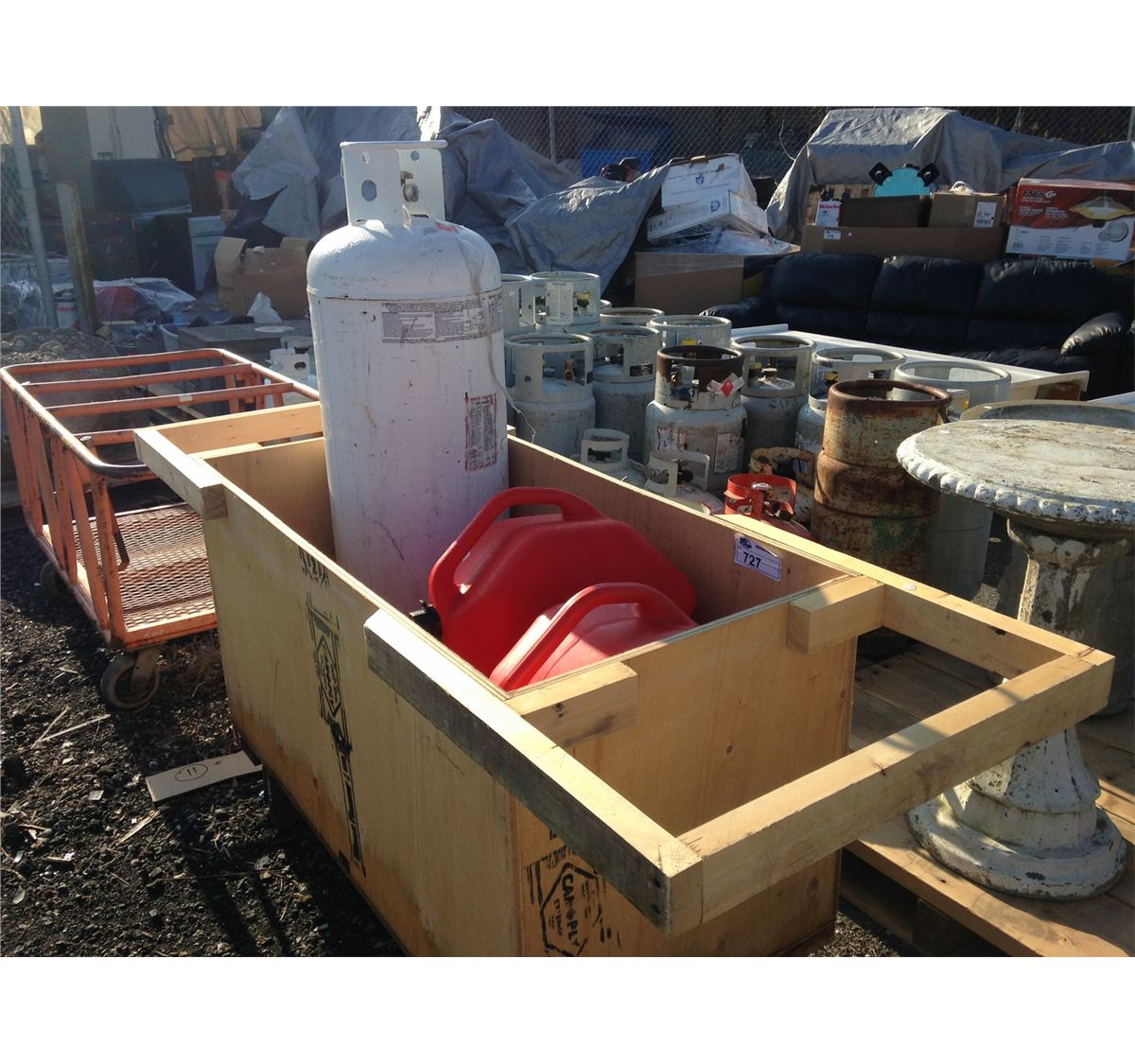 WOODEN ROLLING SHOP STORAGE BOX WITH CONTENTS; LARGE PROPANE TANK AND 5 RED JERRY CANS