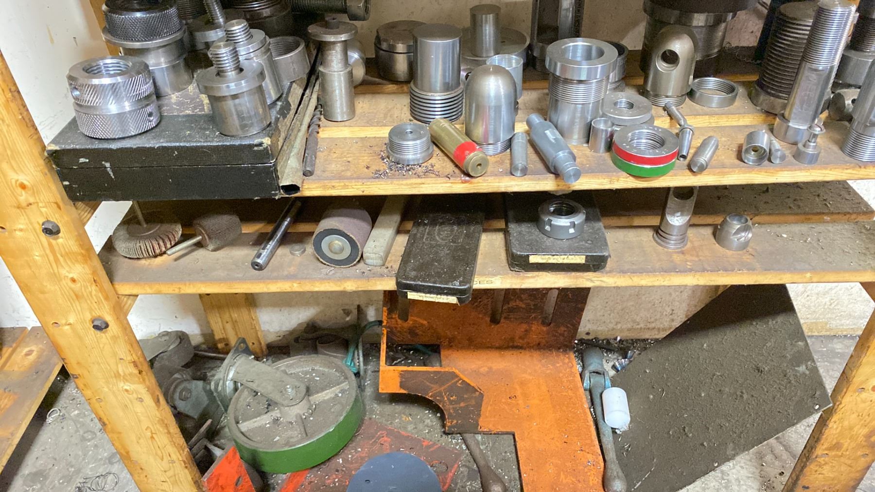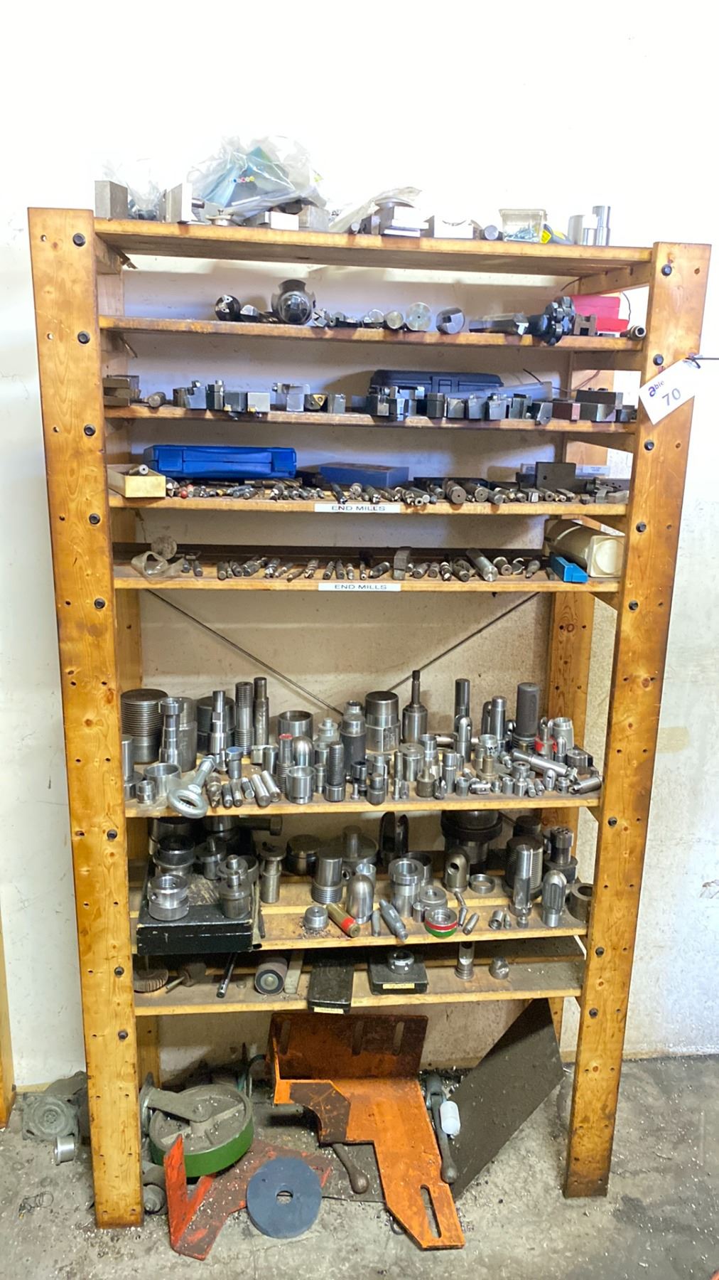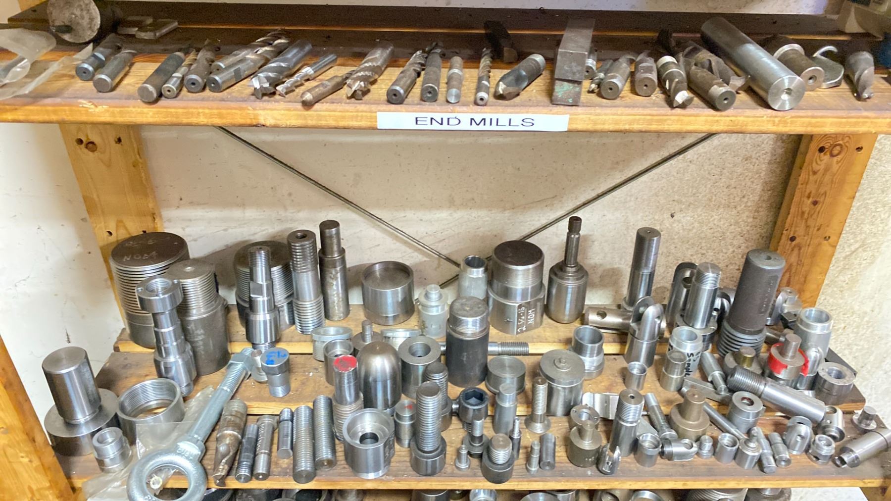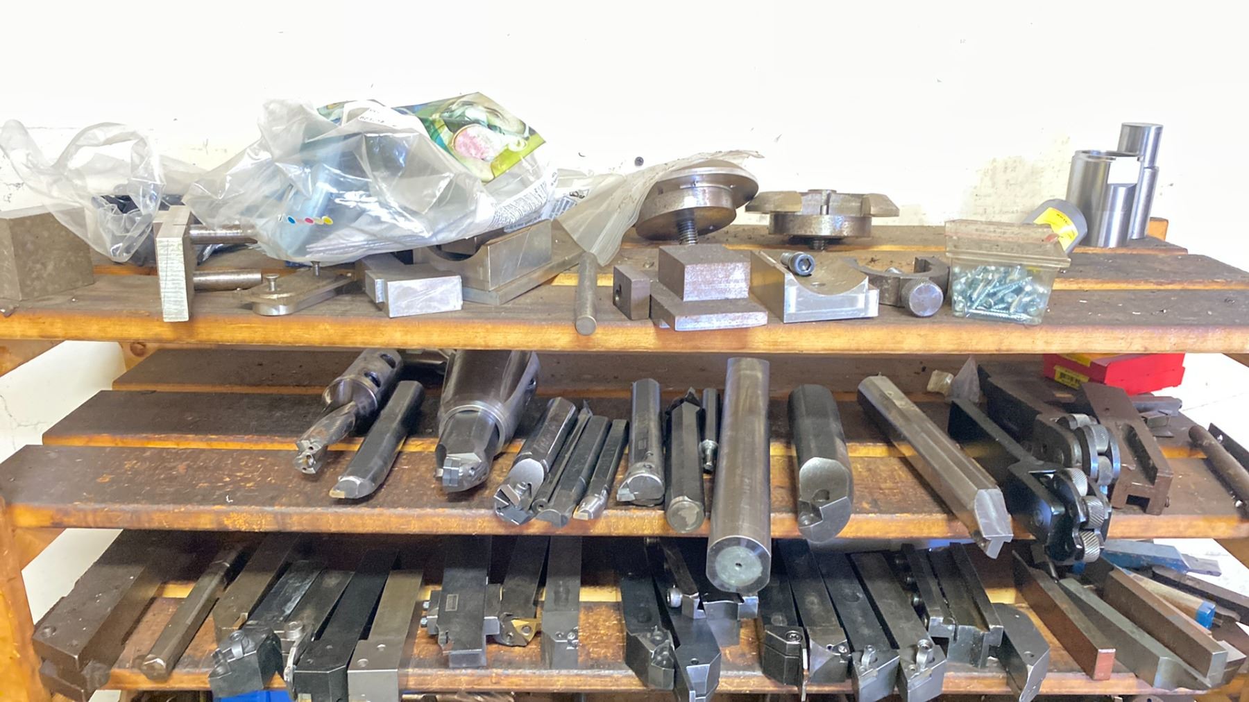 WOODEN SHELF UNIT FILLED WITH ASSORTED MACHINIST TOOLING PARTS AND ACCESSORIES FOR LATHE, MILLING MACHINE AND DRILLING