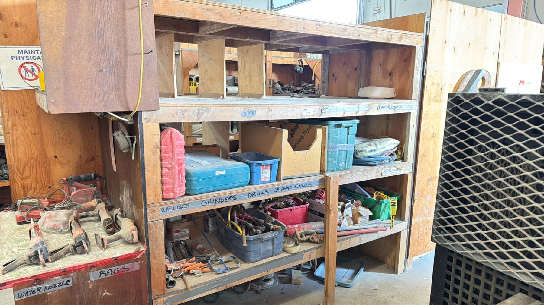 WOODEN SHELF UNIT WITH ASSORTED ITEMS INCLUDING BOLT CUTTERS, COMPOUND GUNS, SAW BLADES, DRILL BITS, HOSES & HEAVY DUTY TOOLS *MUST TAKE SHELF*
