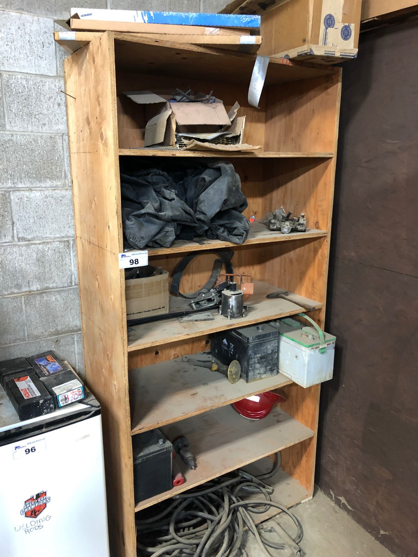 WOODEN SHELF WITH CONTENTS INCLUDING: BATTERIES, HARDWARE, WELDING CABLE & MORE