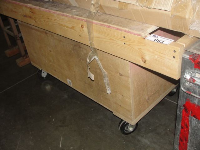 WOODEN SHOP STORAGE TABLE ON CASTERS