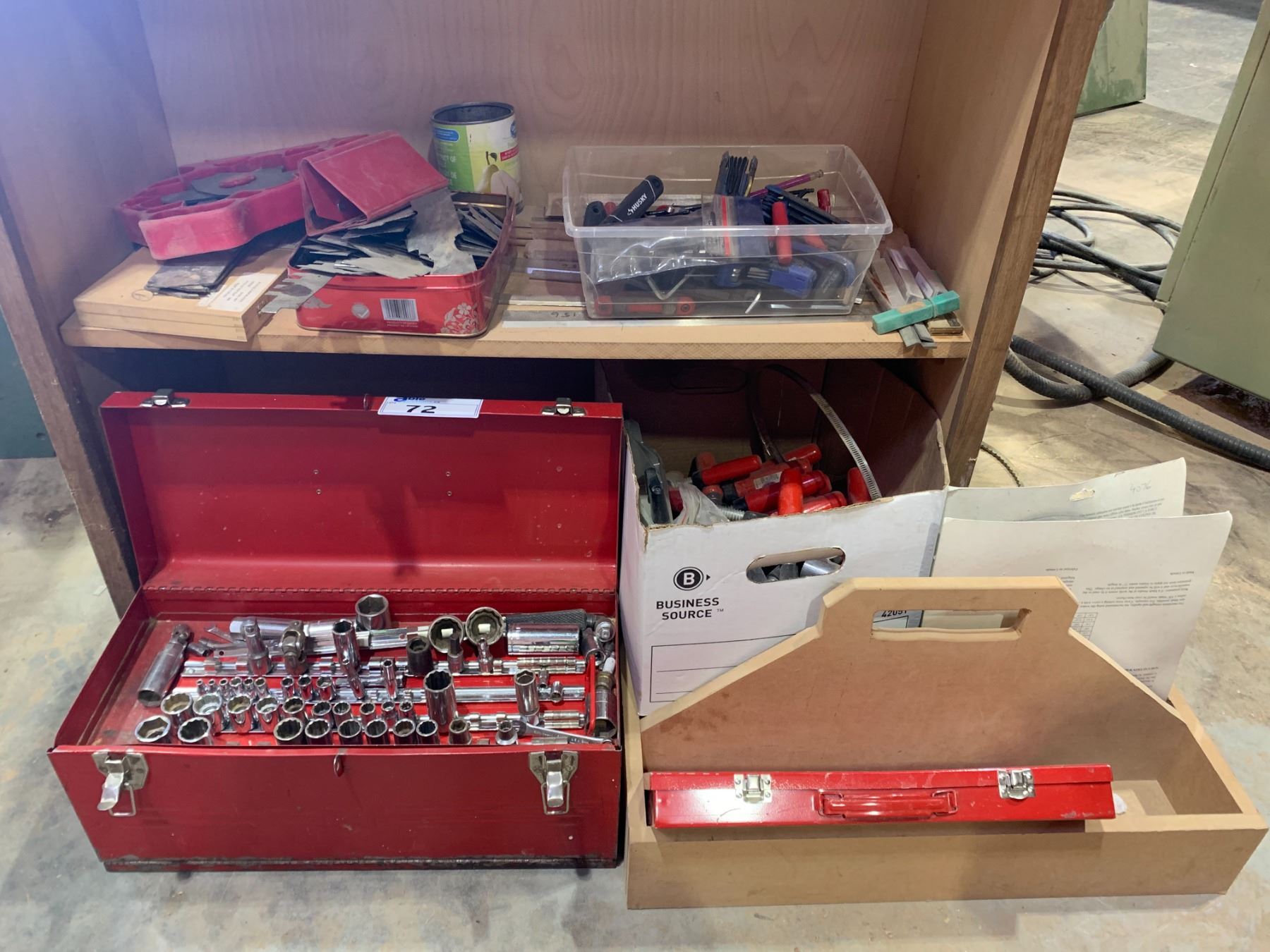 WOODEN STORAGE SHELF (APPROX. 3.5'W X 1.5'D X 3.5'H) FILLED WITH CLAMPS, SOCKETS, ASSORTED ALLEN KEYS & SAW BLADES