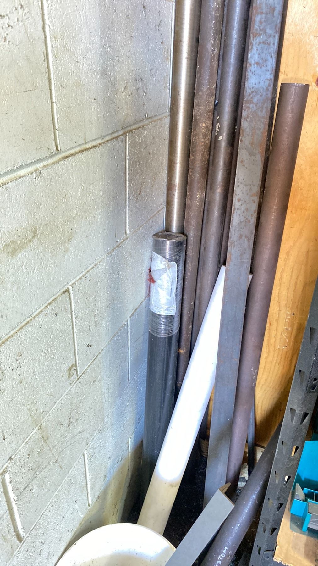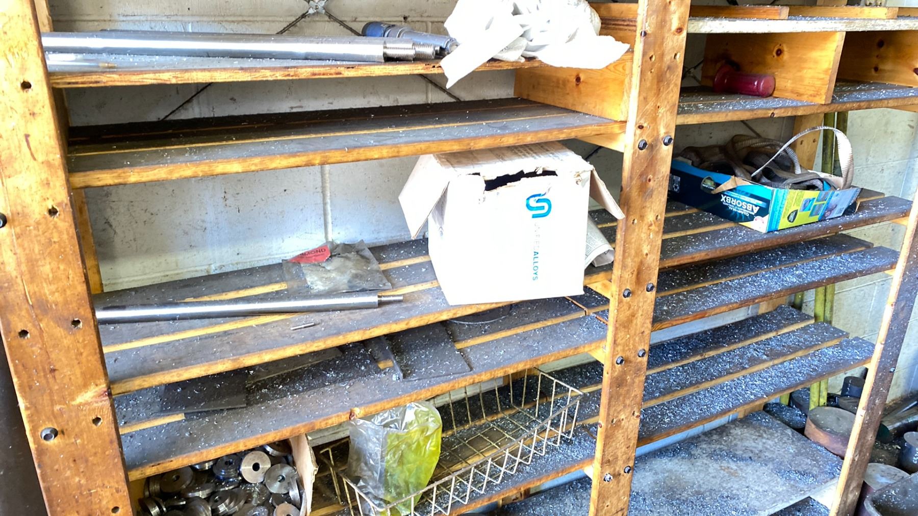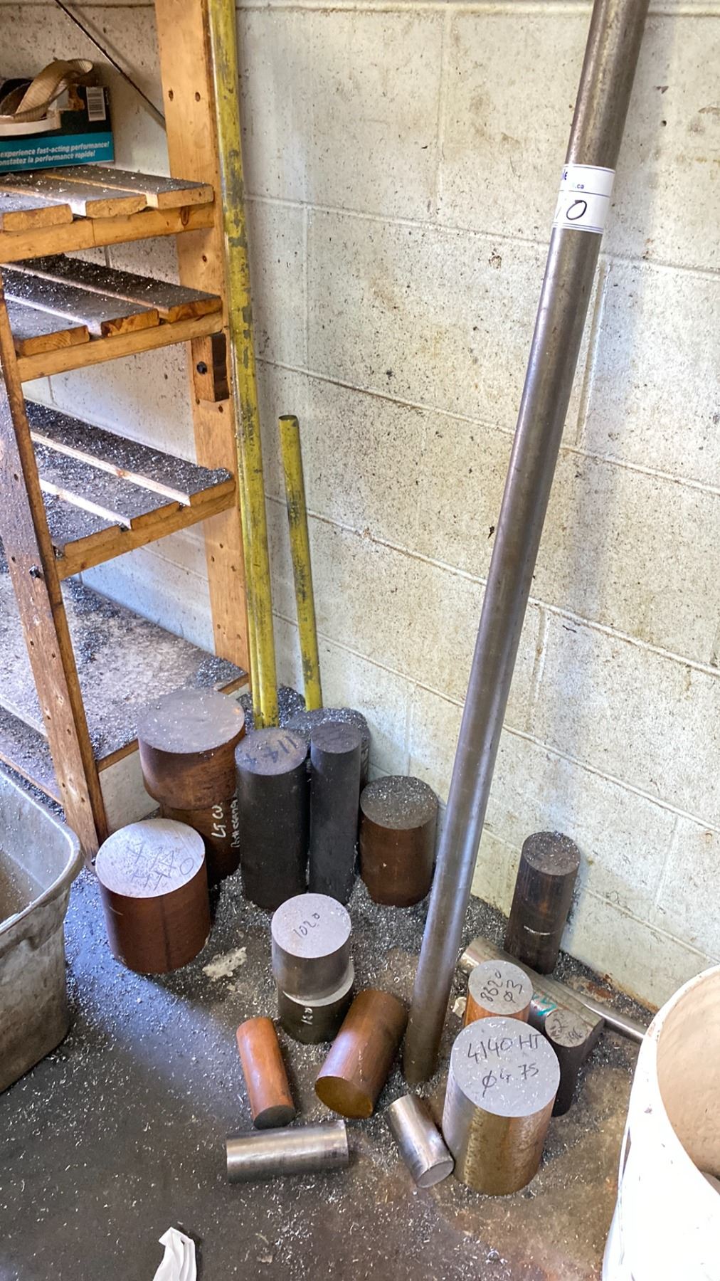 WOODEN STORAGE SHELF WITH ASSORTED ROUND STOCK METAL MATERIAL