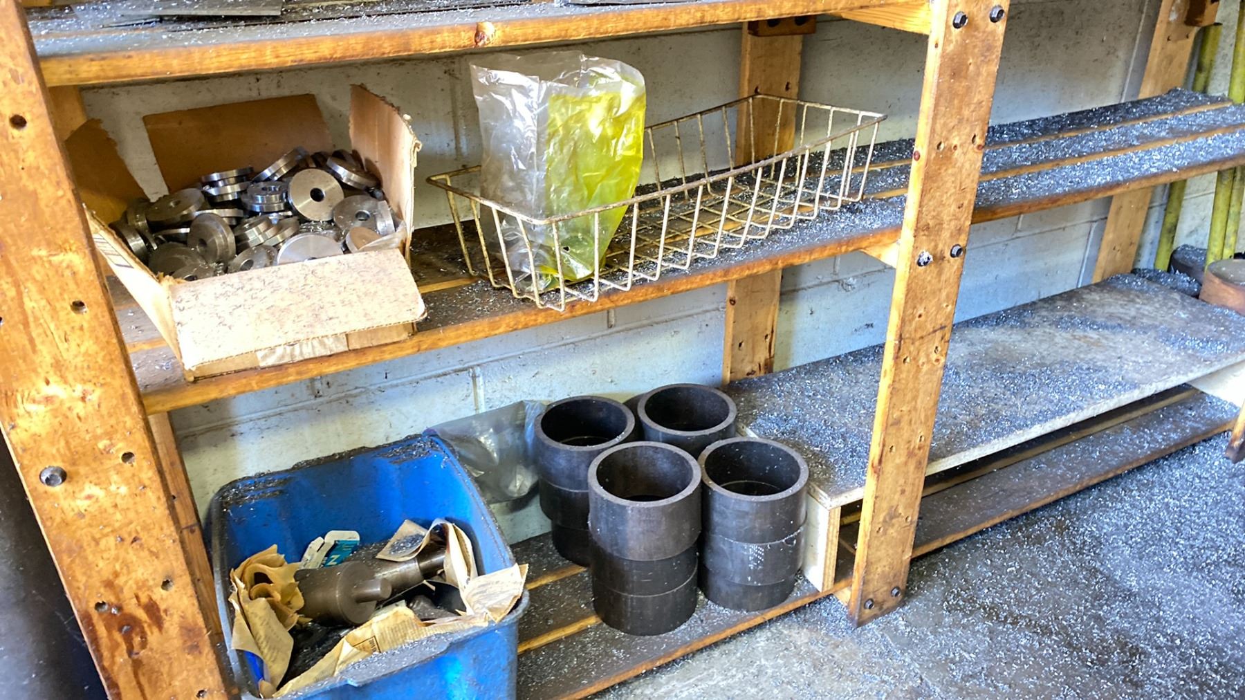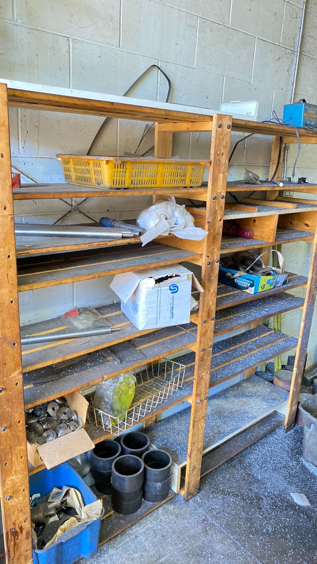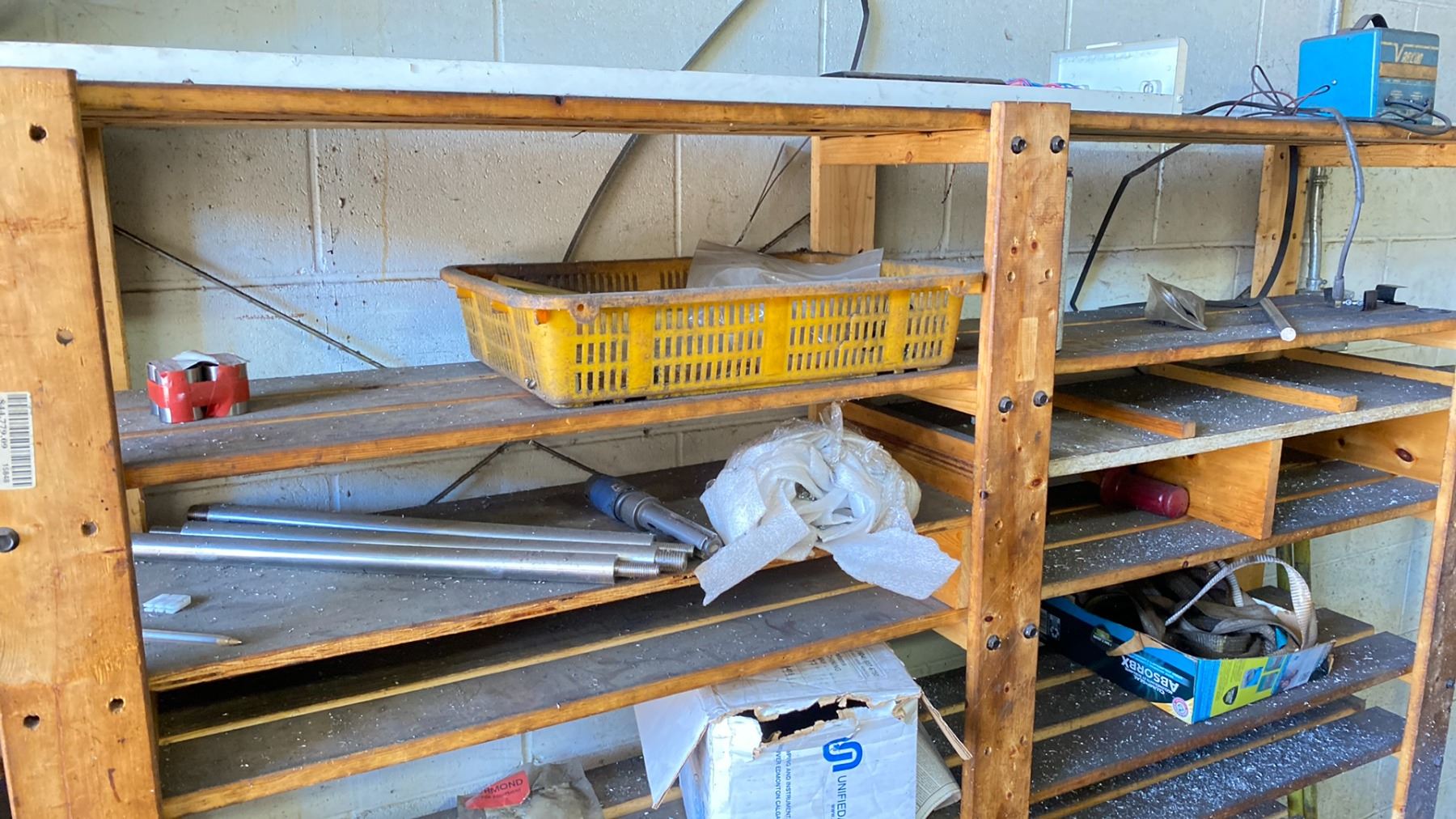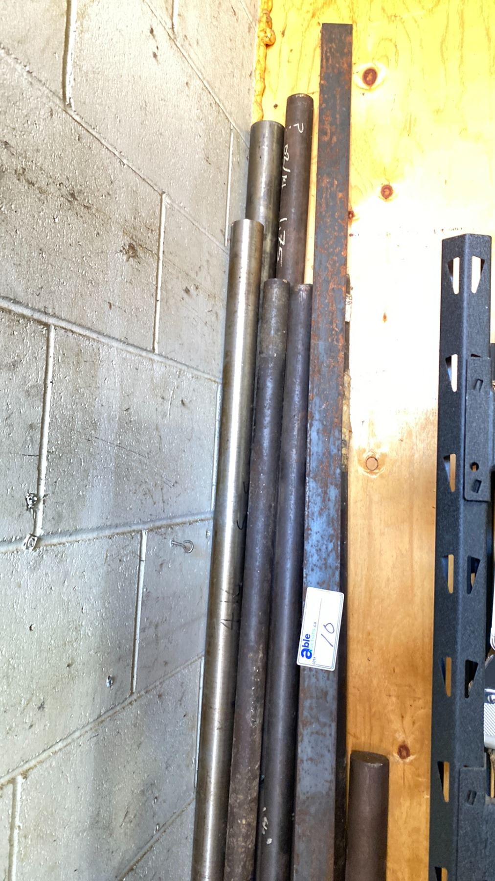 WOODEN STORAGE SHELF WITH ASSORTED ROUND STOCK METAL MATERIAL