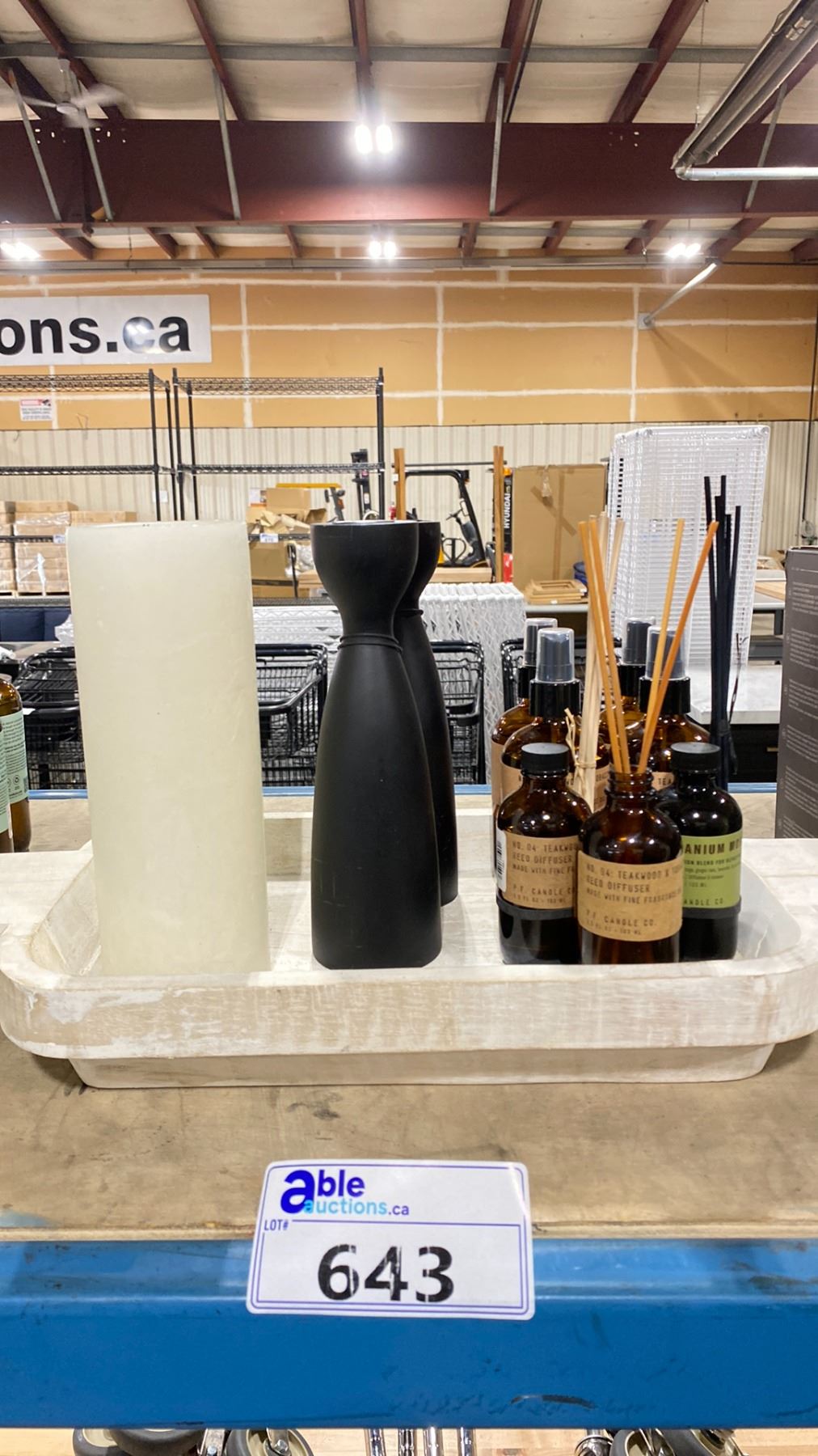 WOODEN TRAY WITH CANDLES, CANDLE HOLDERS, DIFFUSERS AND ROOM SPRAY