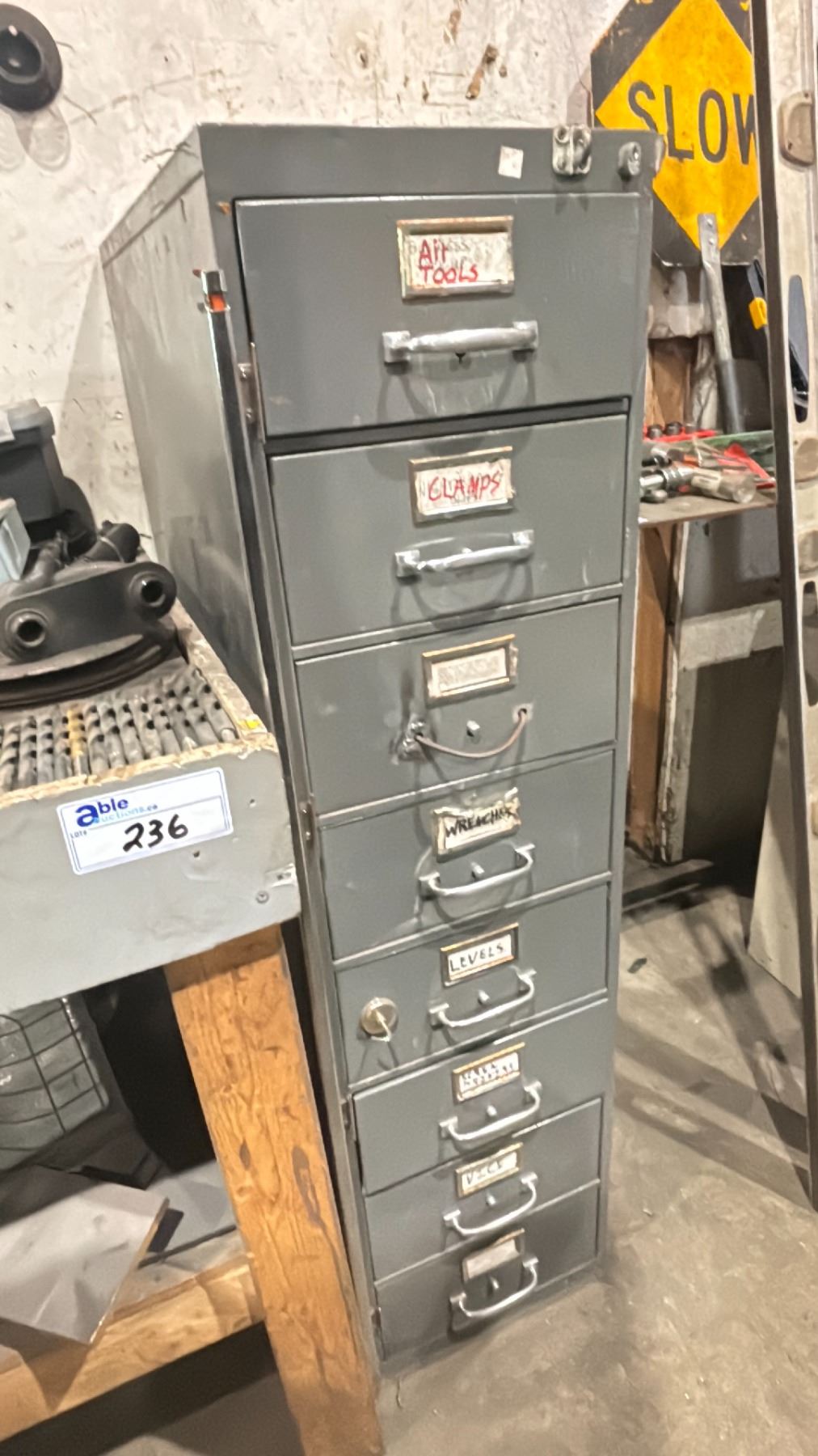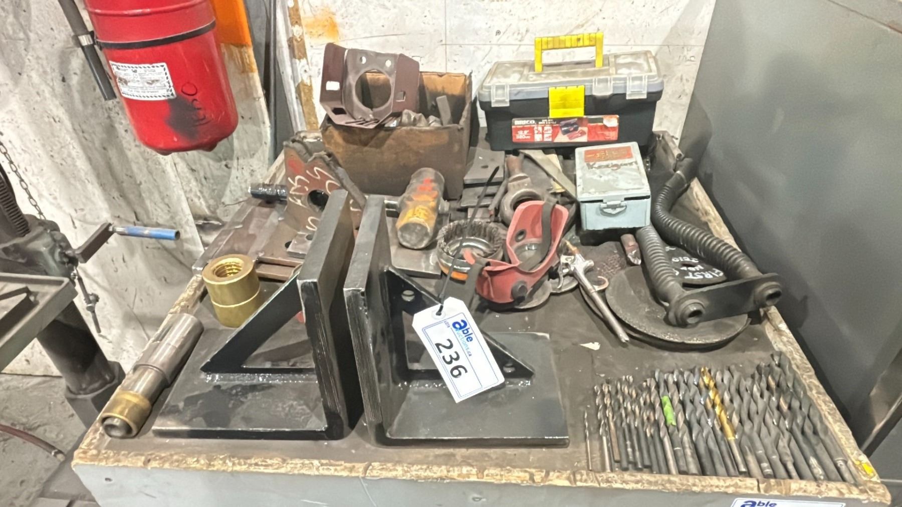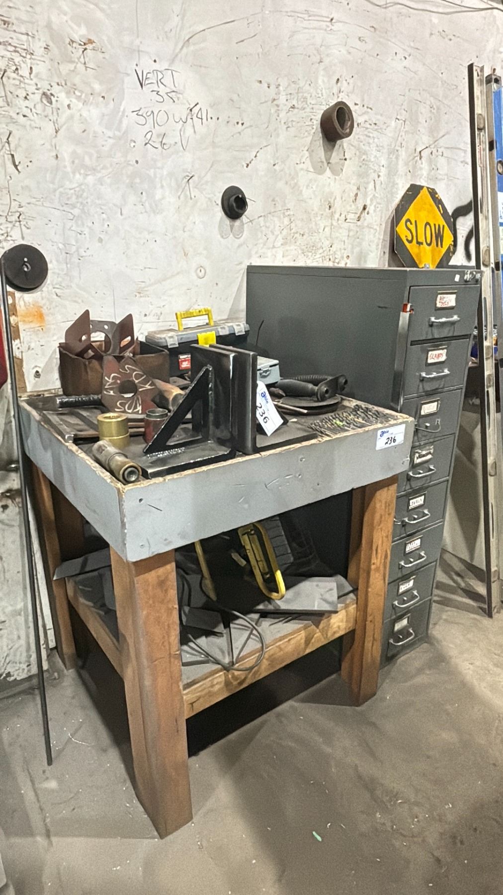 WOODEN WORK BENCH, 8 DRAWER METAL LOCKING CABINET AND ASSORTED METAL FABRICATING MISCELLANEOUS