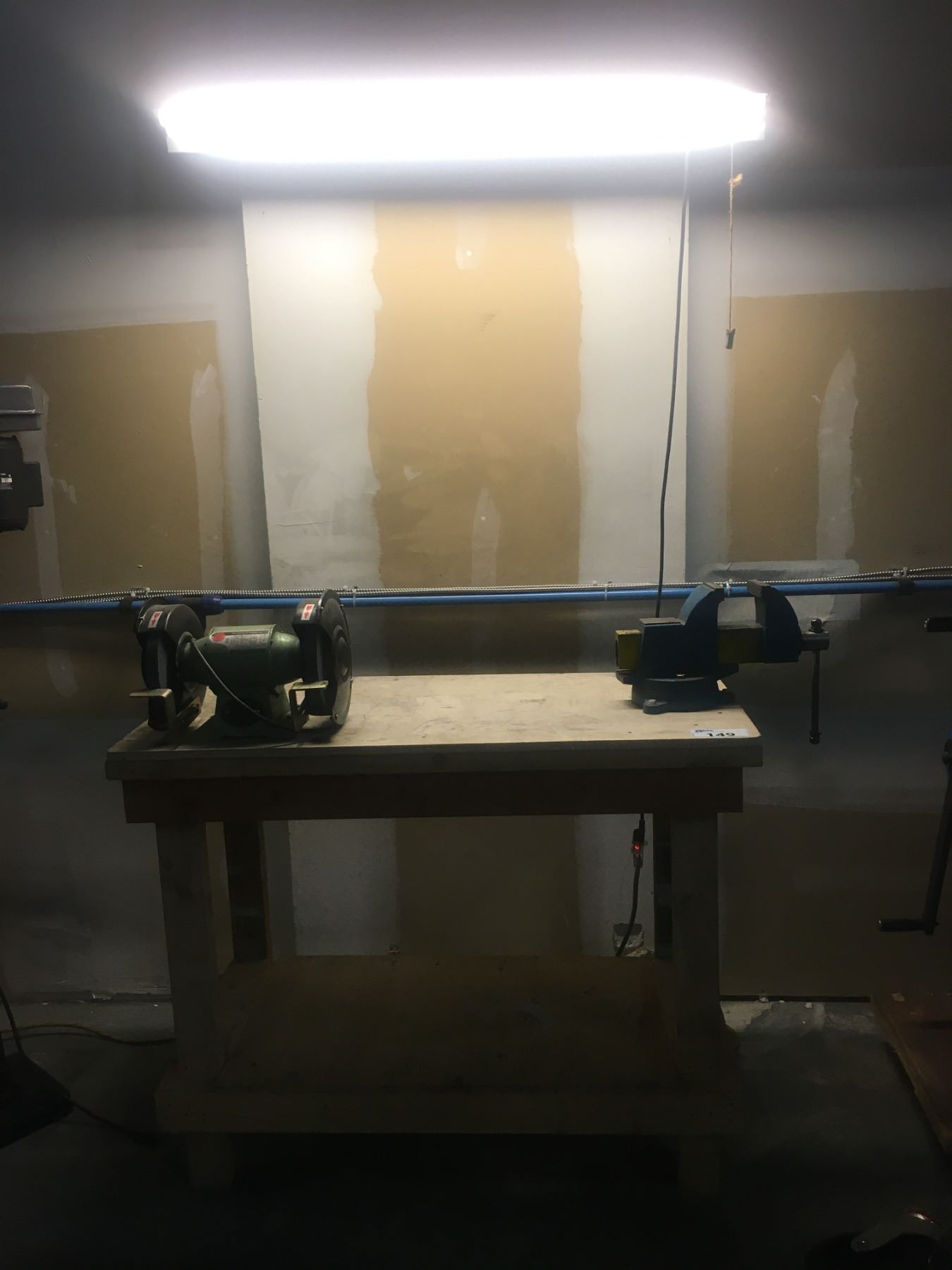 WOODEN WORK TABLE WITH 4" MECHANICS VISE, 8" BENCH GRINDER AND OVERHEAD LIGHT