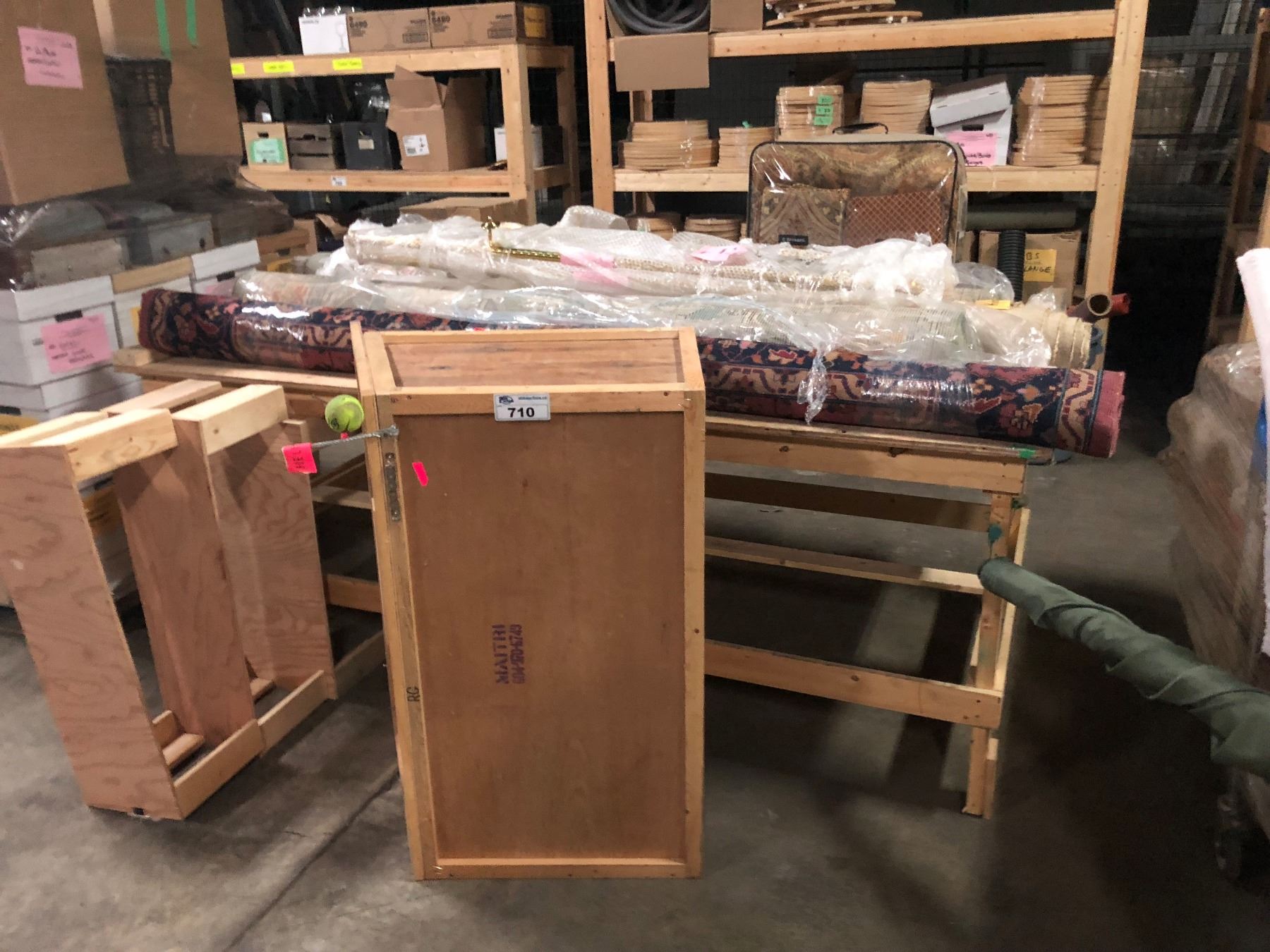 WOODEN WORK TABLE WITH ASSORTED AREA RUGS & CARPET