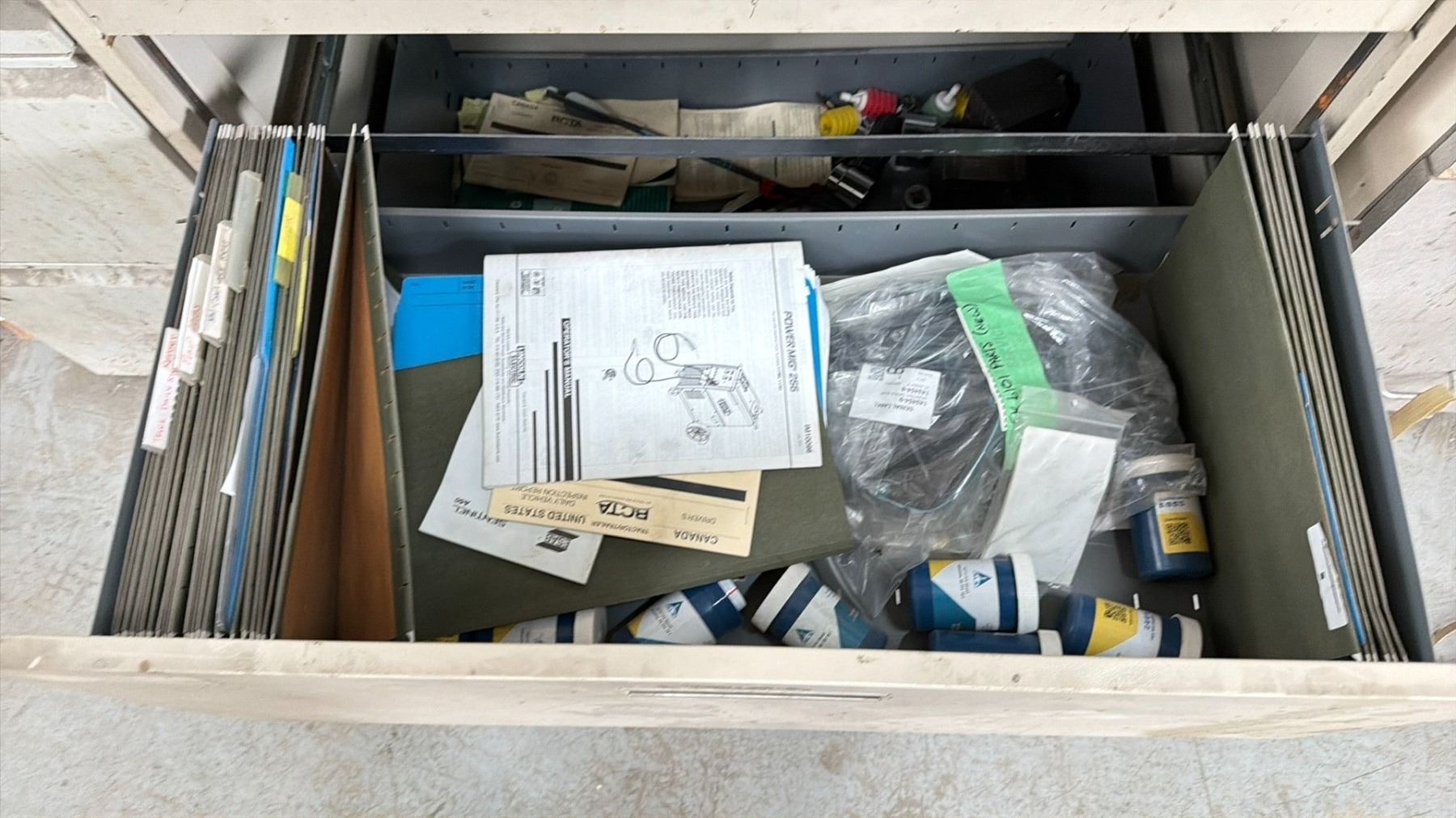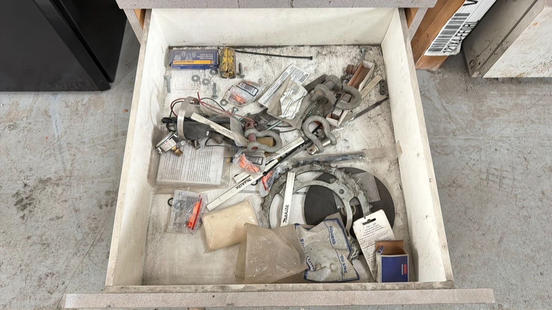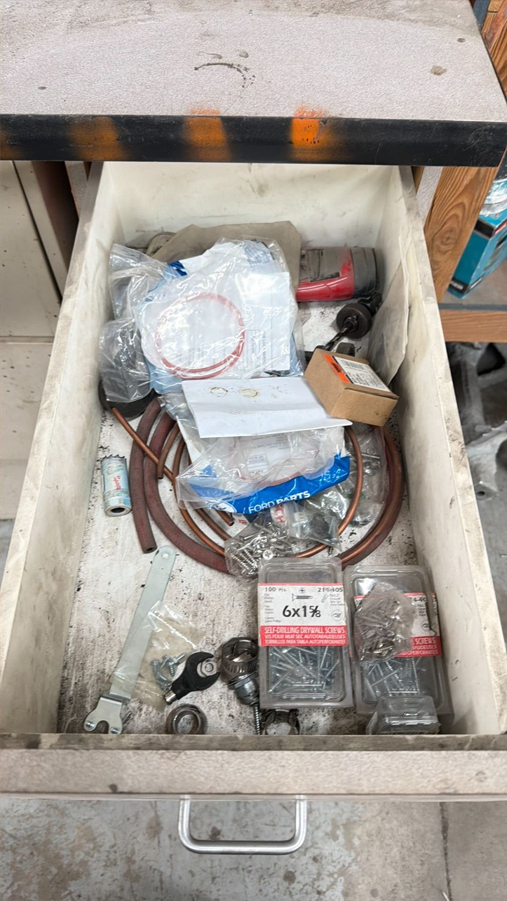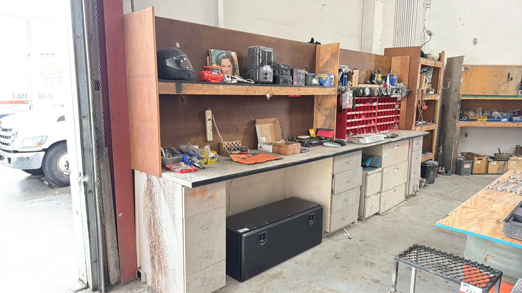 WORK BENCH W/BACKBOARD AND 5 CABINETS WITH ASSORTED MISCELLANEOUS ITEMS INCLUDED MEASURES APPROX. 14FT ACROSS X 3FT WIDE X 7 1/2FT TALL *MUST TAKE ALL* **LAST DAY REMOVAL**