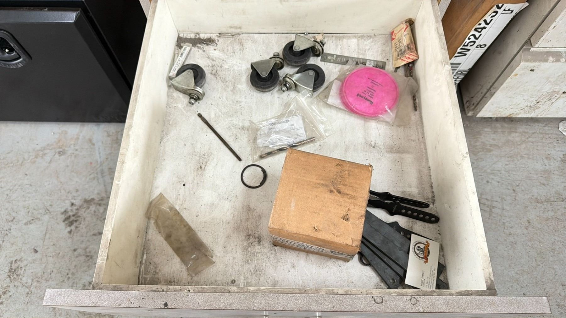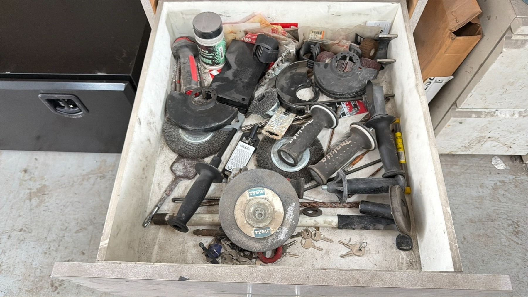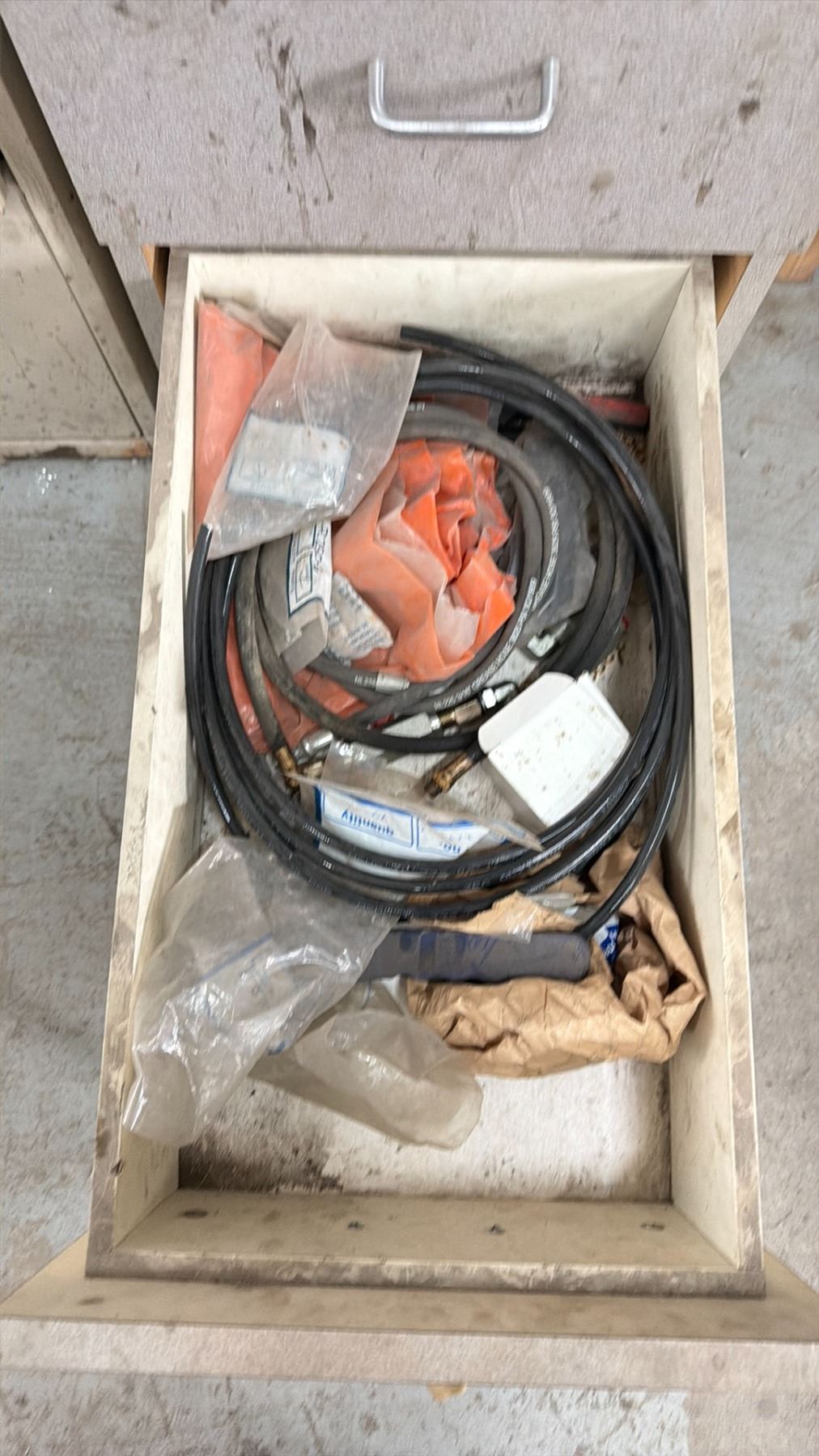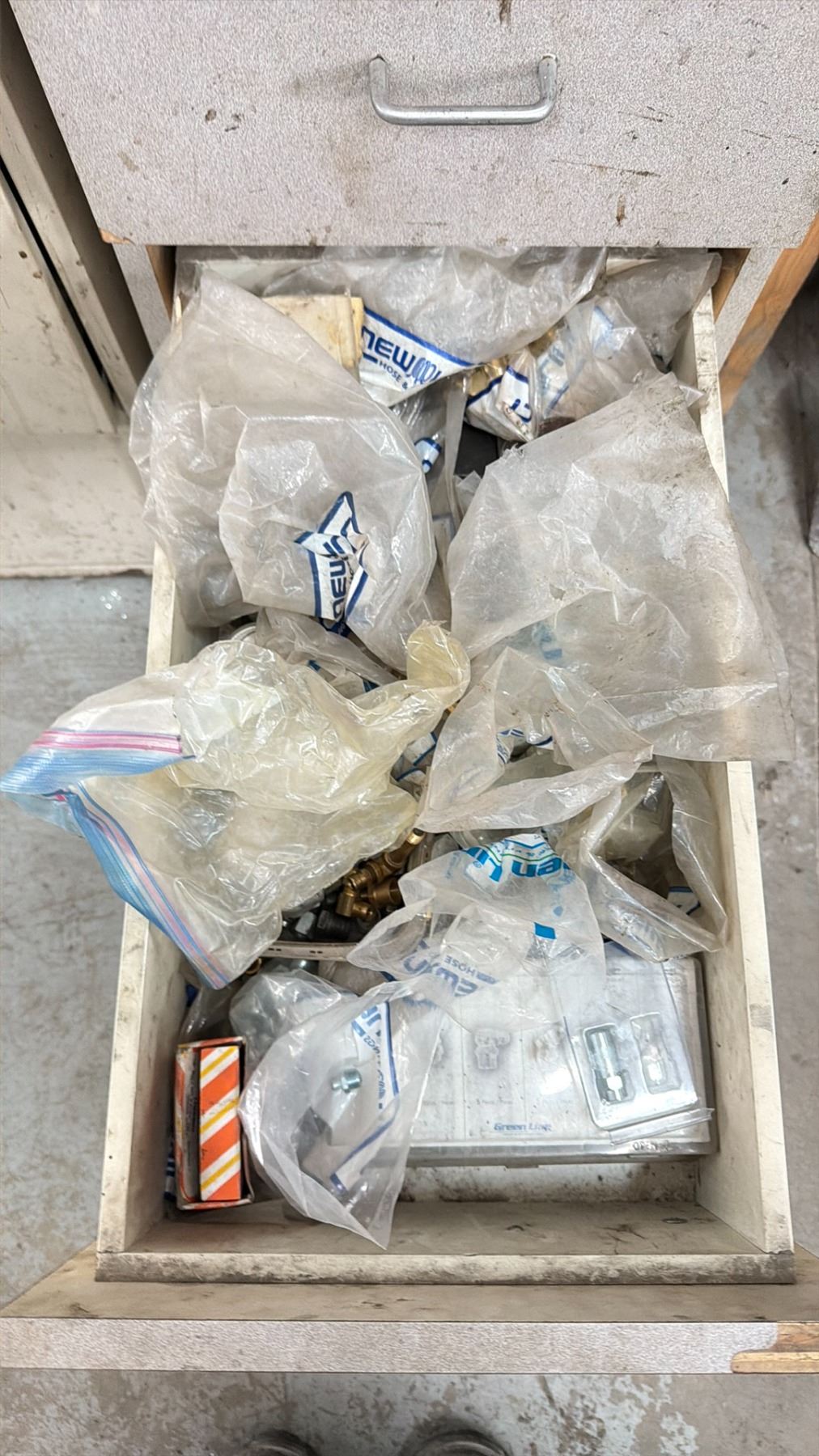 WORK BENCH W/BACKBOARD AND 5 CABINETS WITH ASSORTED MISCELLANEOUS ITEMS INCLUDED MEASURES APPROX. 14FT ACROSS X 3FT WIDE X 7 1/2FT TALL *MUST TAKE ALL* **LAST DAY REMOVAL**