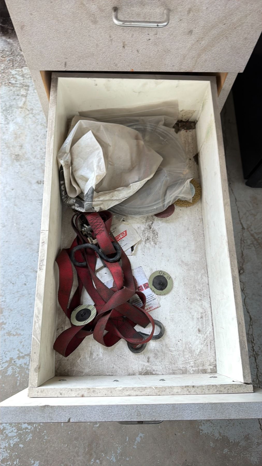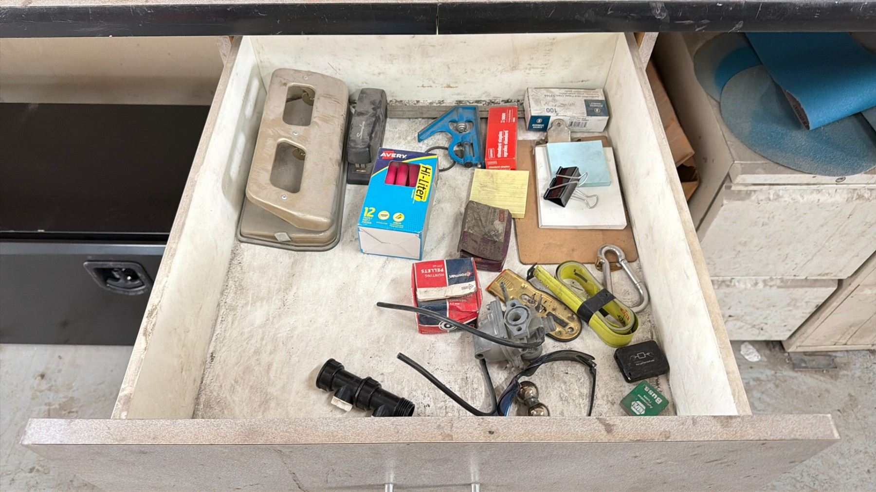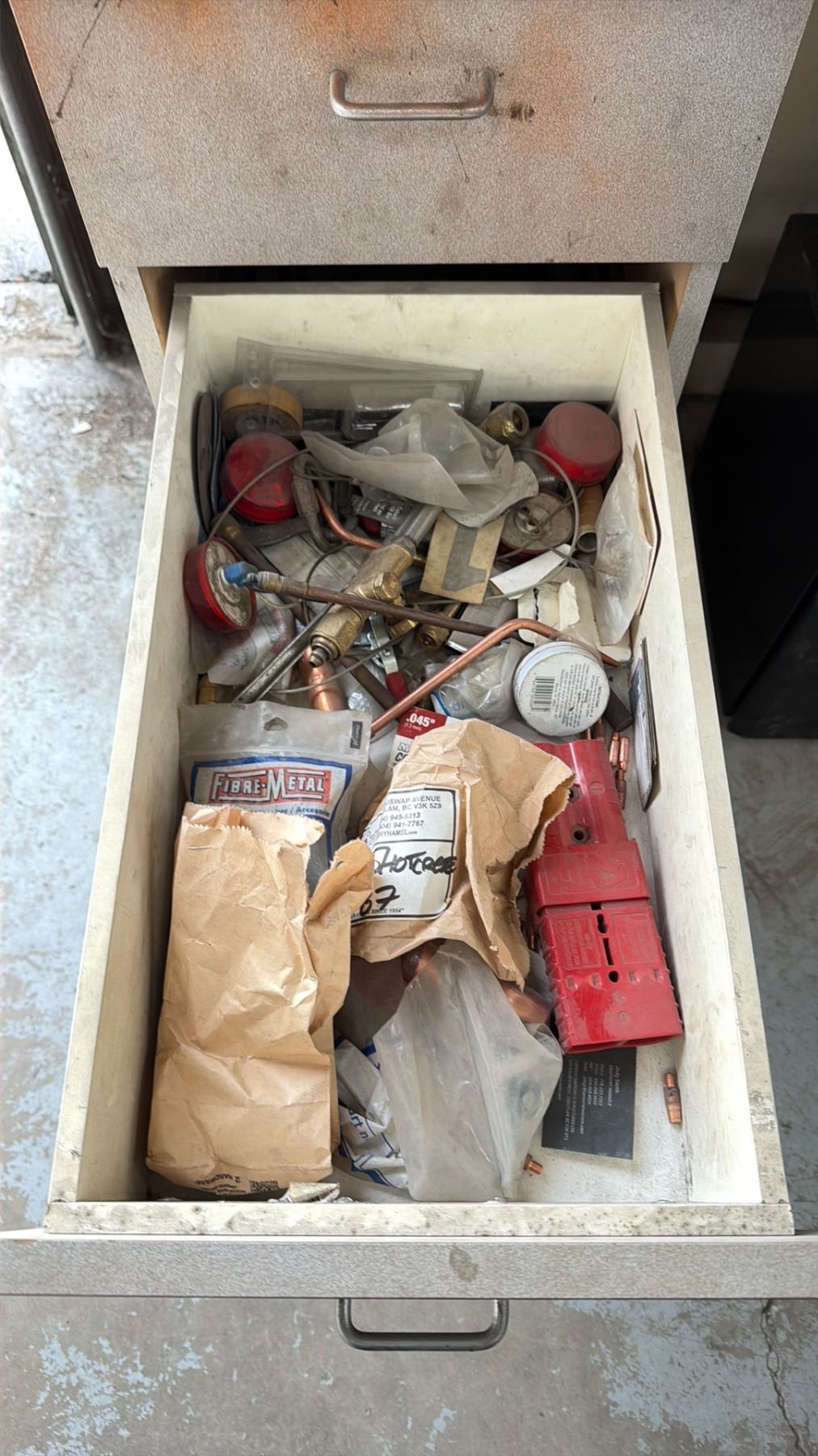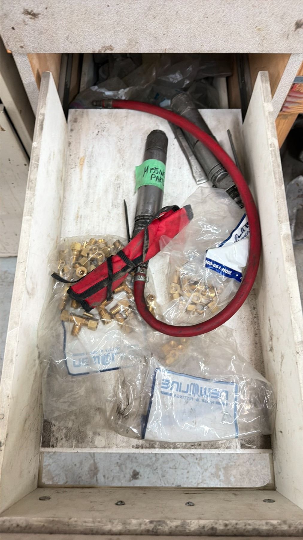 WORK BENCH W/BACKBOARD AND 5 CABINETS WITH ASSORTED MISCELLANEOUS ITEMS INCLUDED MEASURES APPROX. 14FT ACROSS X 3FT WIDE X 7 1/2FT TALL *MUST TAKE ALL* **LAST DAY REMOVAL**