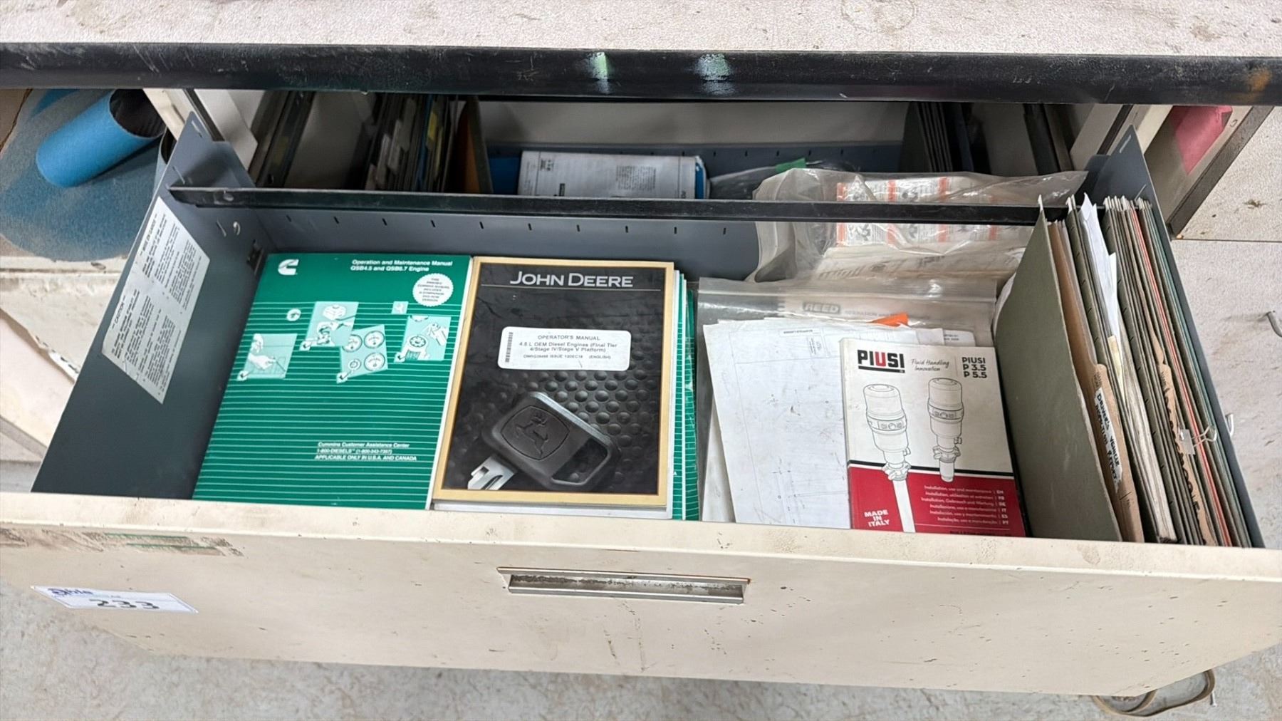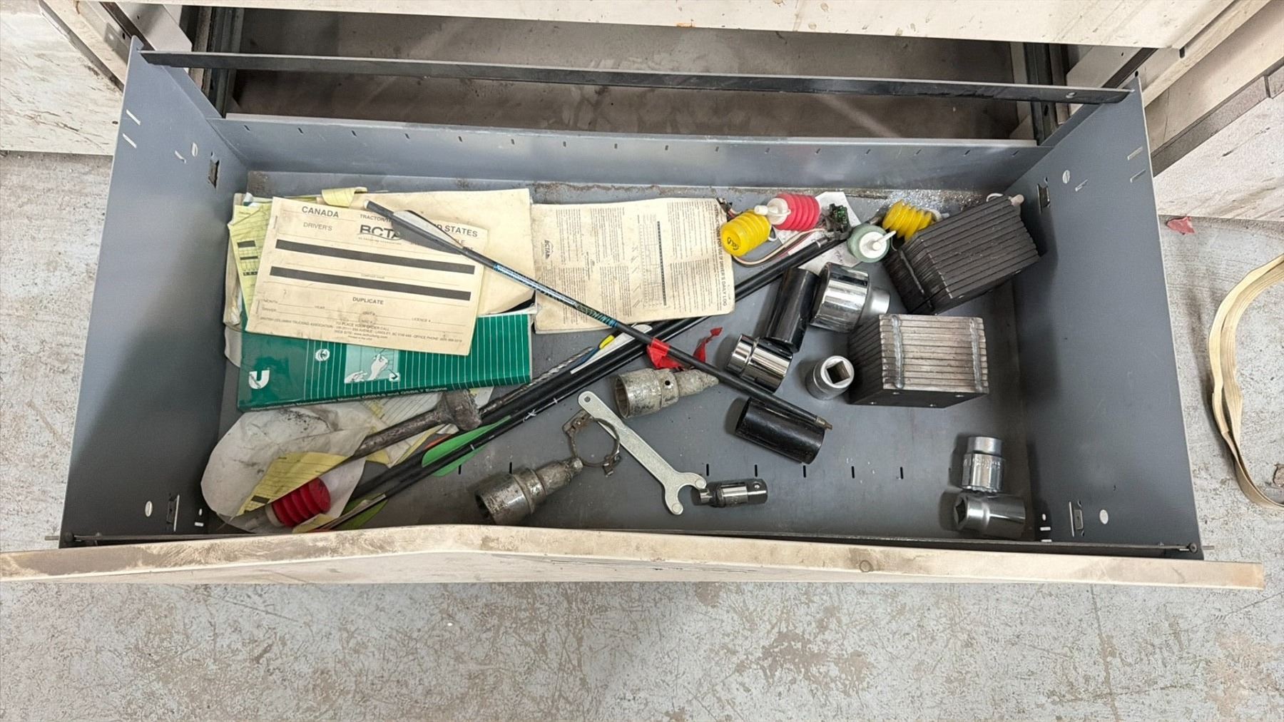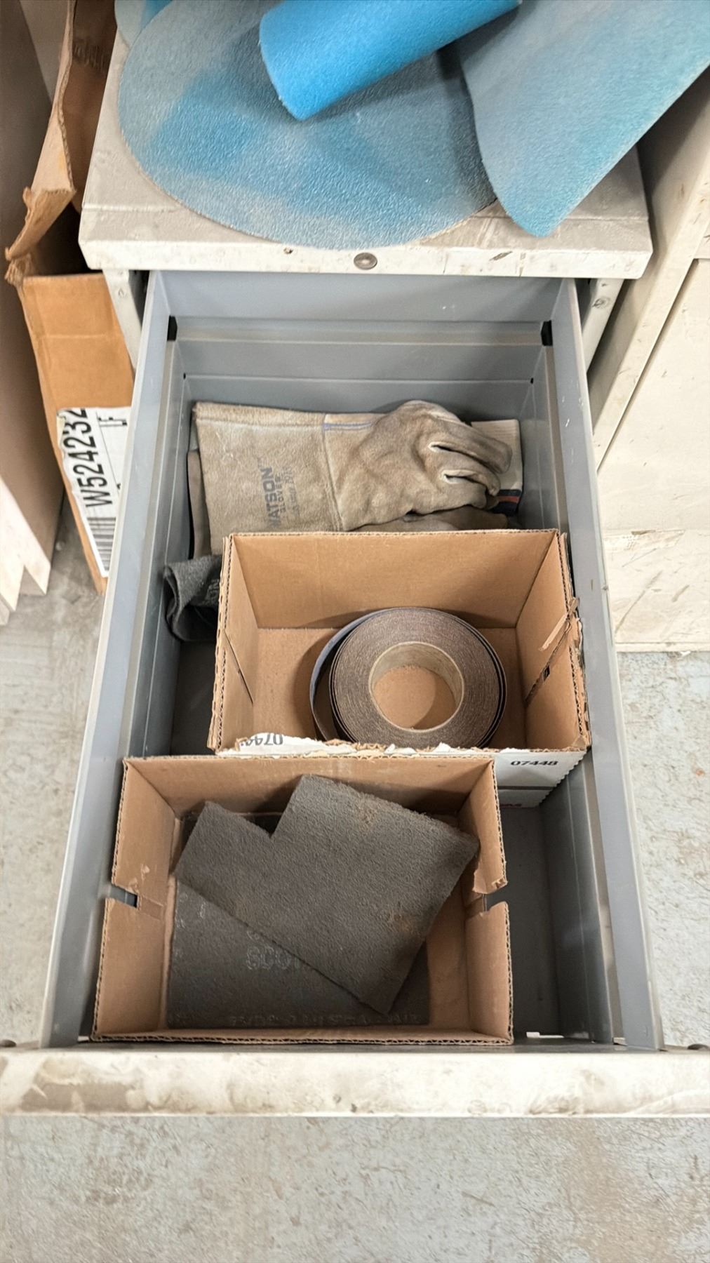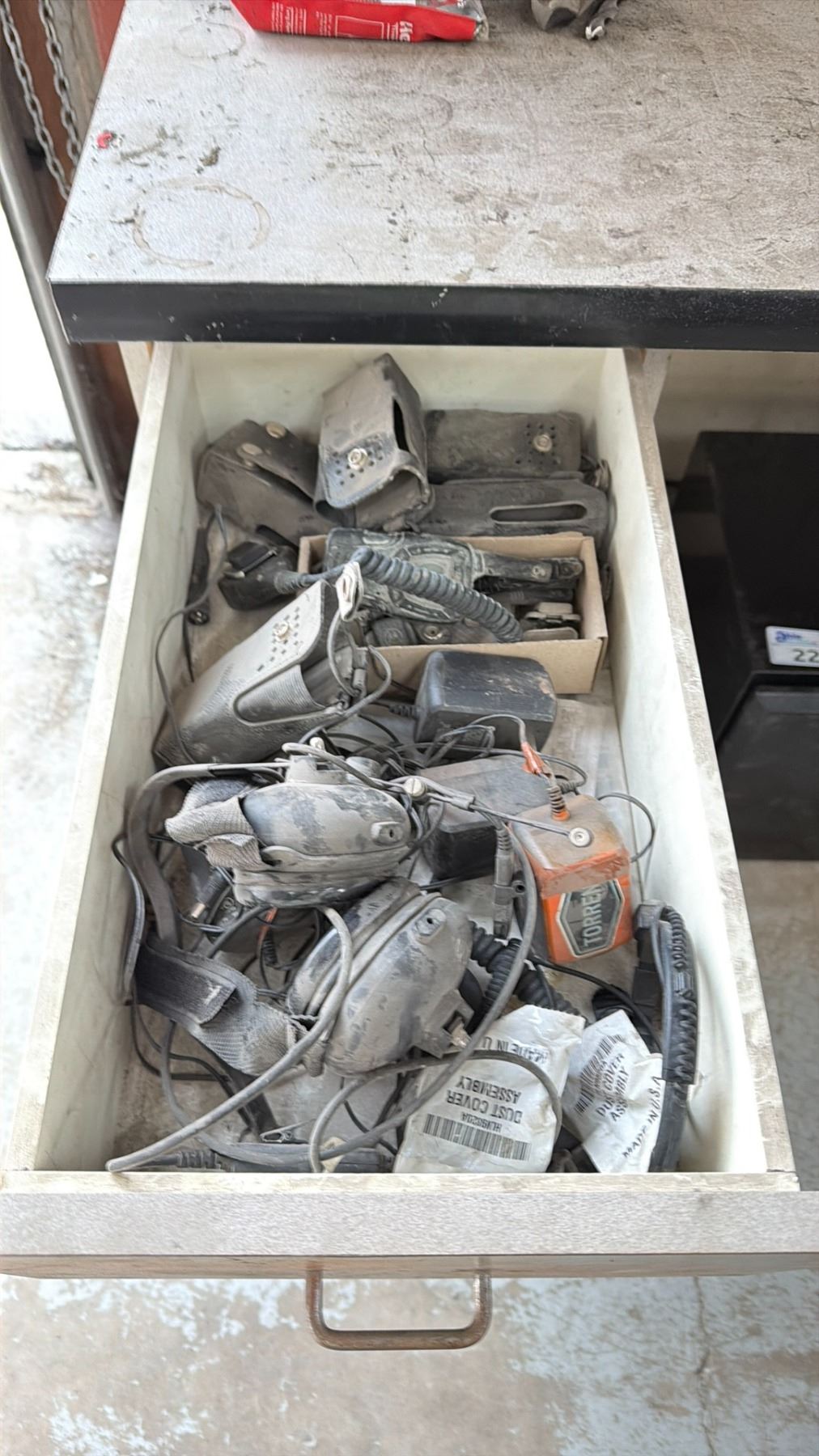 WORK BENCH W/BACKBOARD AND 5 CABINETS WITH ASSORTED MISCELLANEOUS ITEMS INCLUDED MEASURES APPROX. 14FT ACROSS X 3FT WIDE X 7 1/2FT TALL *MUST TAKE ALL* **LAST DAY REMOVAL**