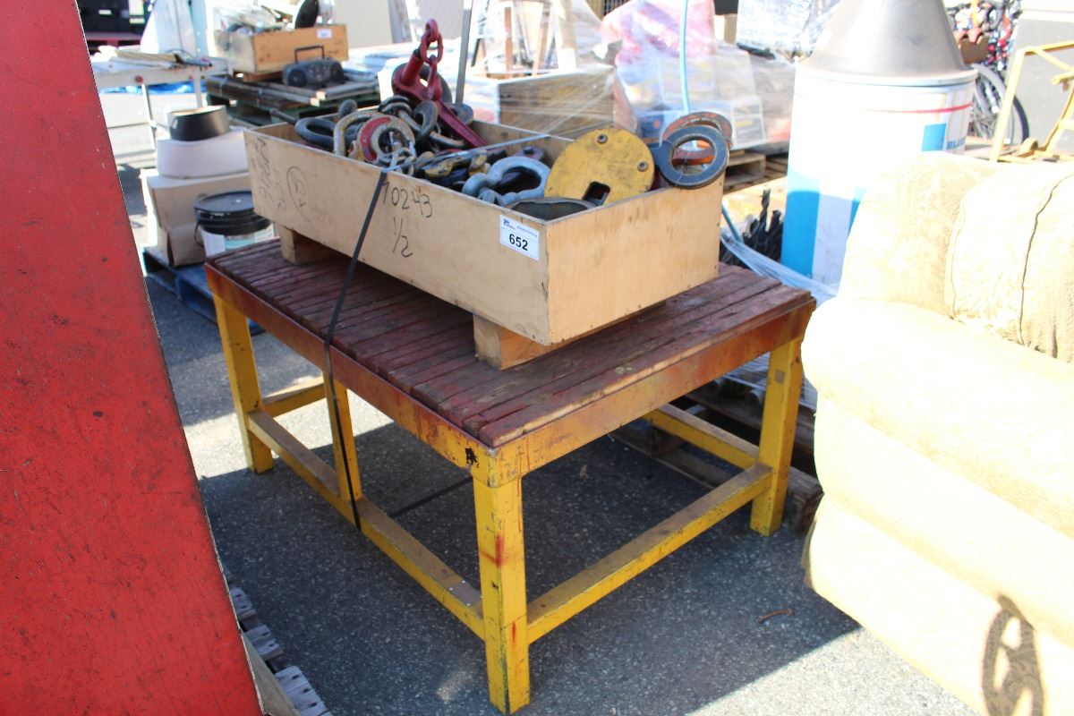 WORK TABLE AND CRATE OF BUCKLES, SINCHES, CHAINS AND MORE