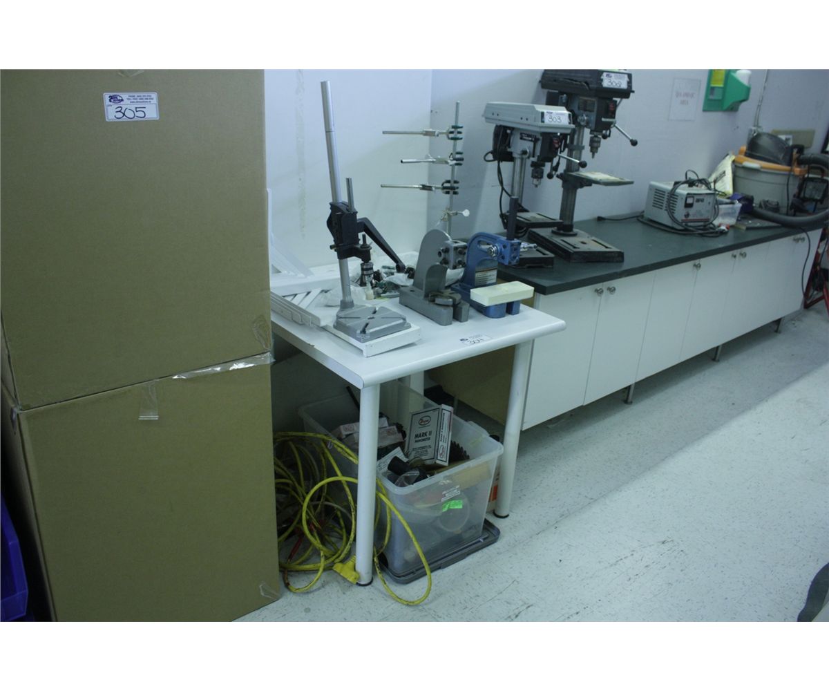 WORK TABLES, CLAMPS, PRESSES AND BOX OF MISC. TOOLS