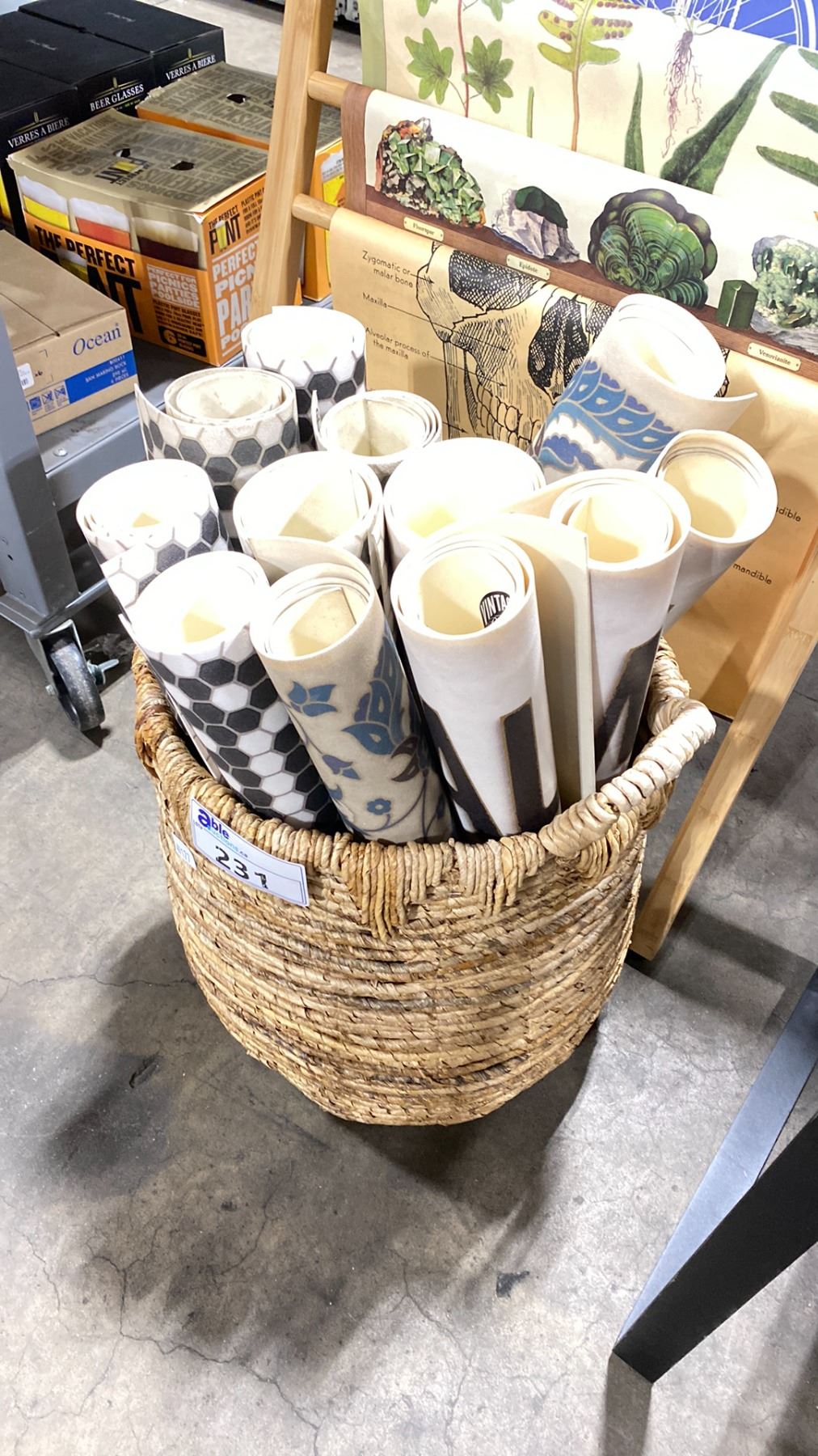 WOVEN STORAGE BASKET WITH ASSORTED VINTAGE VINYL FLOOR CLOTHS