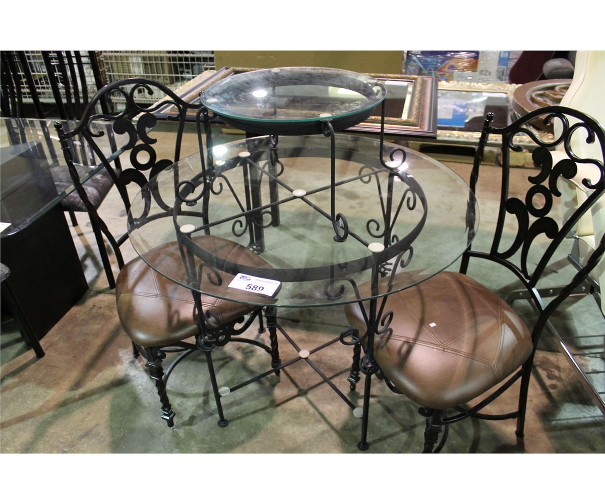 WROUGHT IRON GLASS TABLE WITH 2 CHAIRS AND SMALL GLASS TABLE