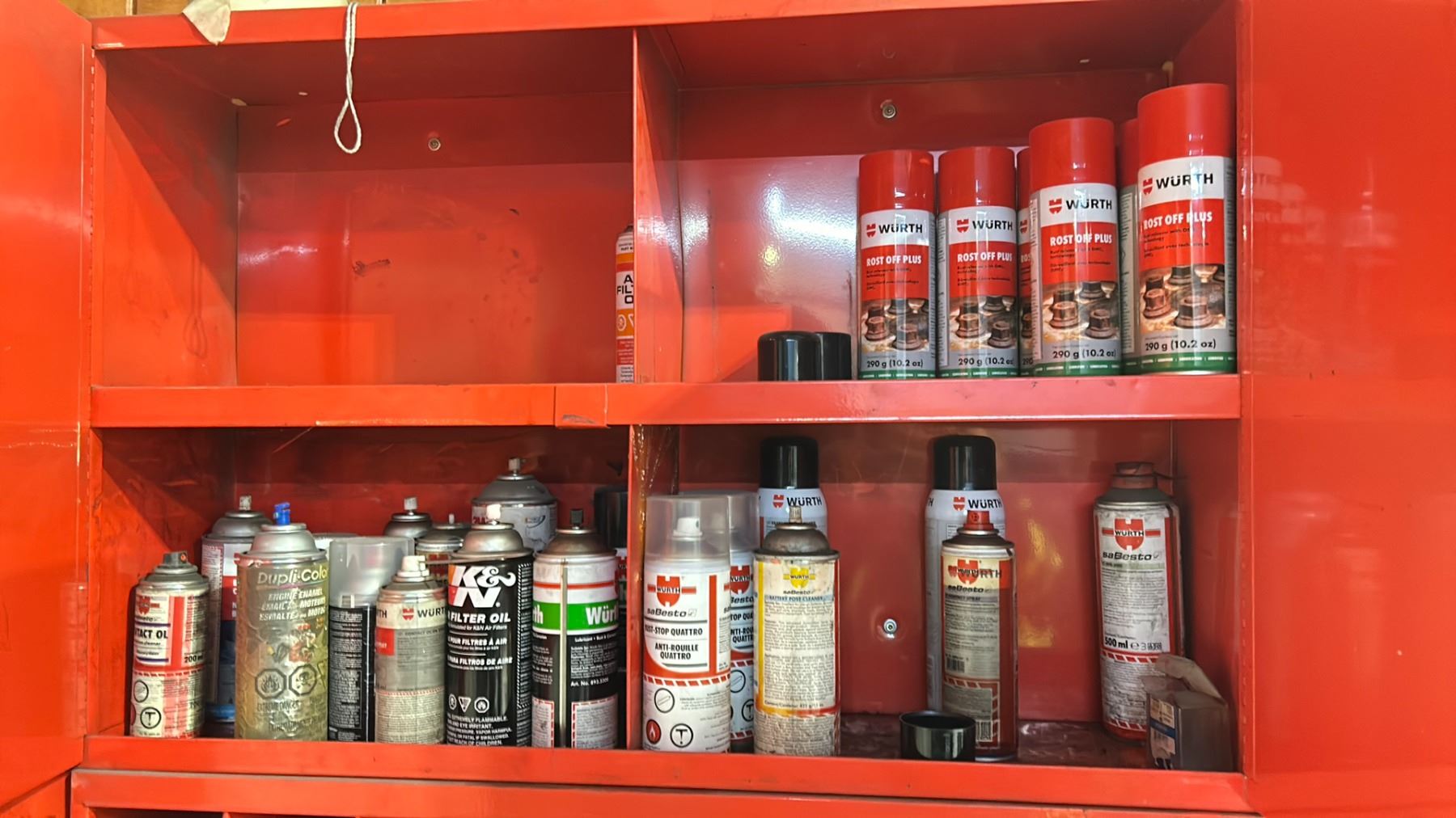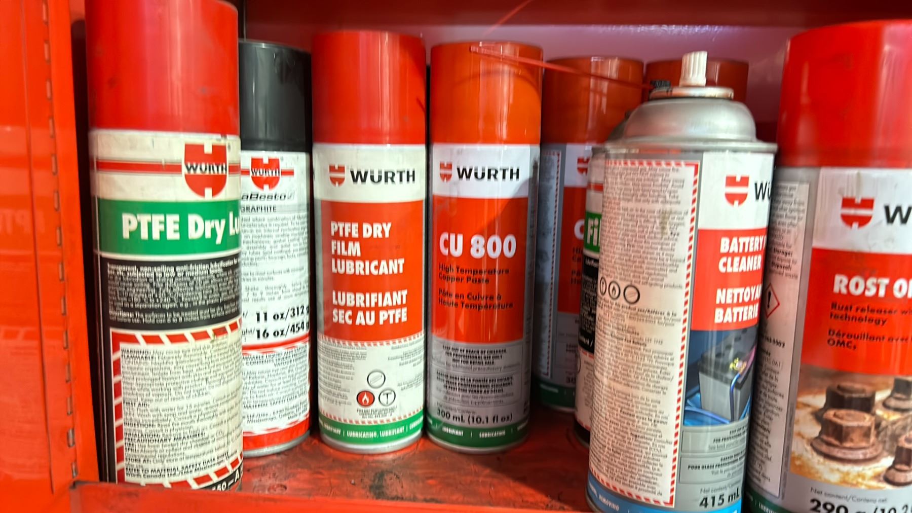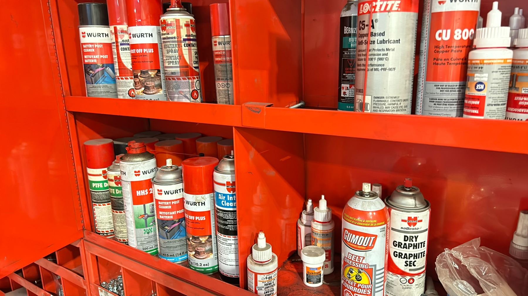 WURTH WALL MOUNT CABINETS WITH CONTENTS. TINS OF WURST RUST RELEASE, SPRAY LUBES, BATTERY CLEANER,