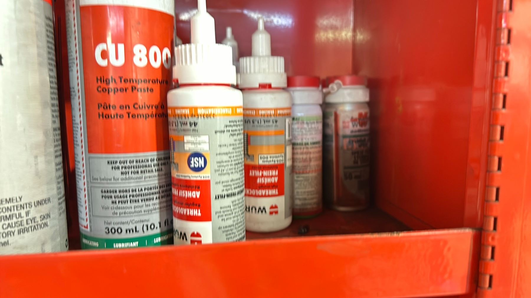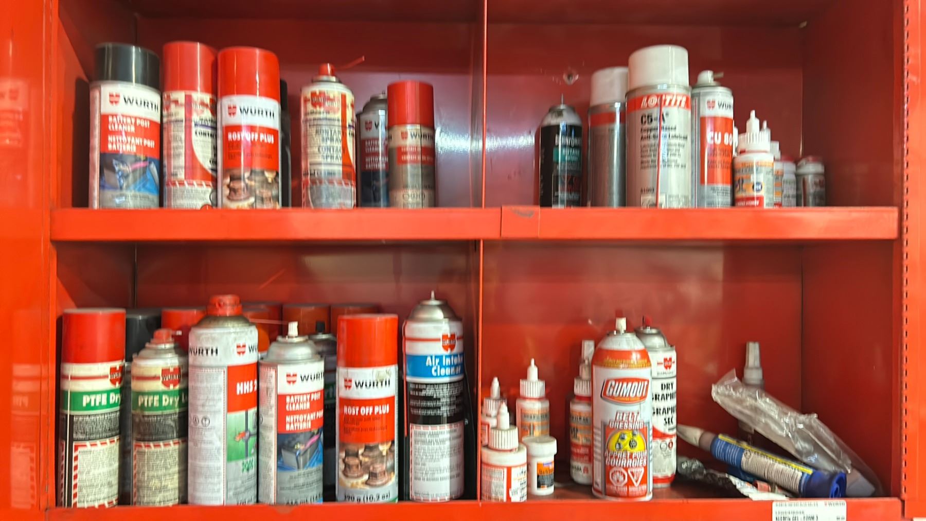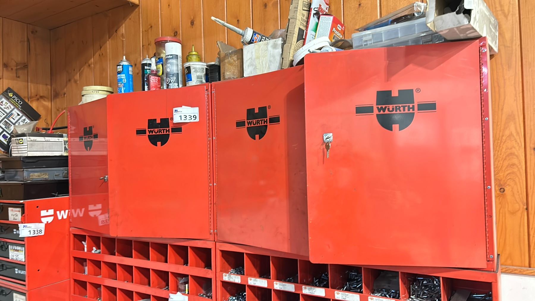 WURTH WALL MOUNT CABINETS WITH CONTENTS. TINS OF WURST RUST RELEASE, SPRAY LUBES, BATTERY CLEANER,