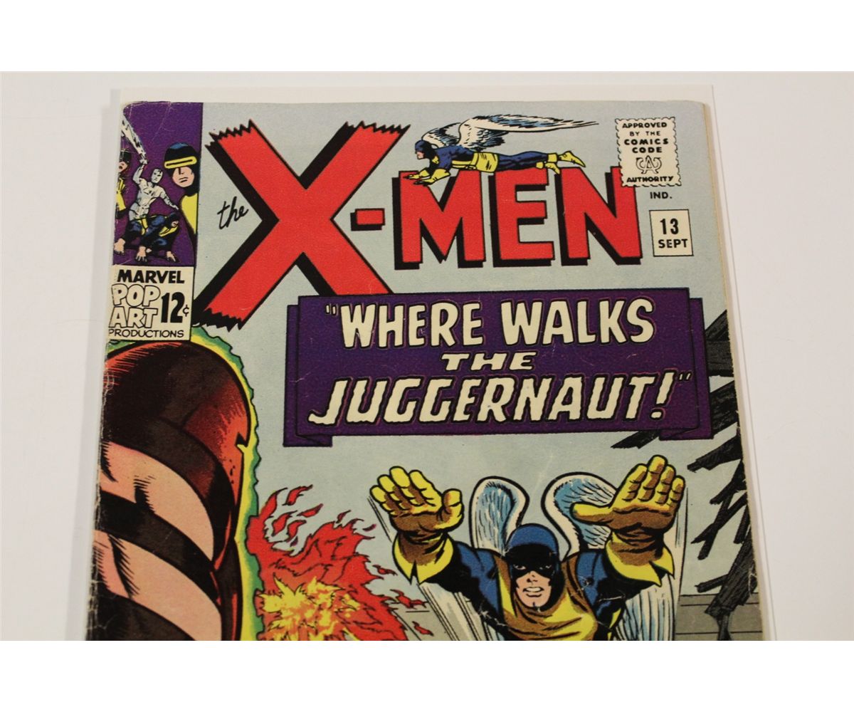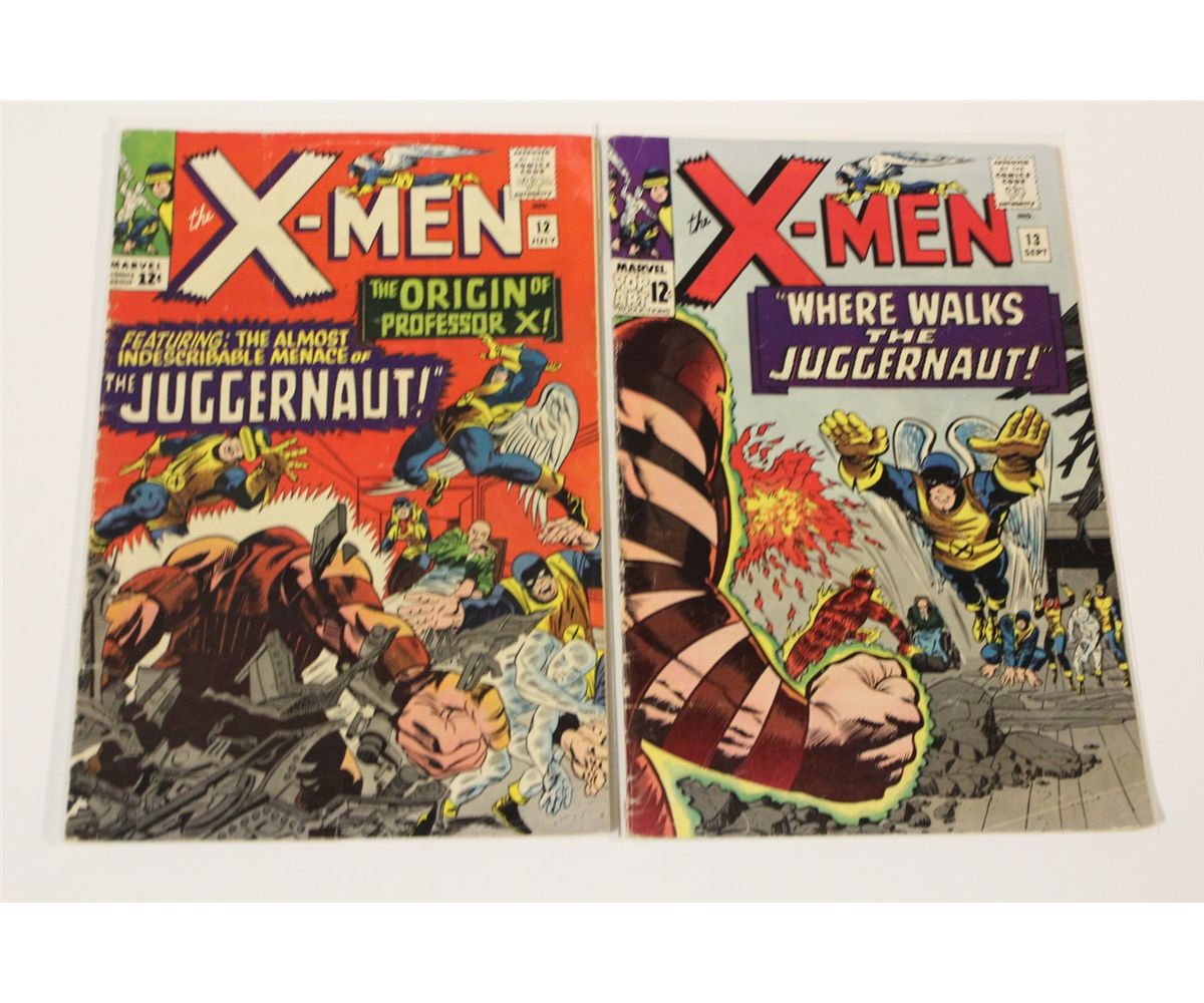 X-MEN #12 & 13 (1965) ORIGIN PROF. X, ORIGIN & 1ST TWO APP. JUGGERNAUT. #12 LOWER GRADE 3' X 1' PIECE OUT OF B/C, #13 LOWER MID GRADE. BOTH HAVE COVERS & CF ATTACHED, TIGHT & SUPPLE. SOLID BOOKS.