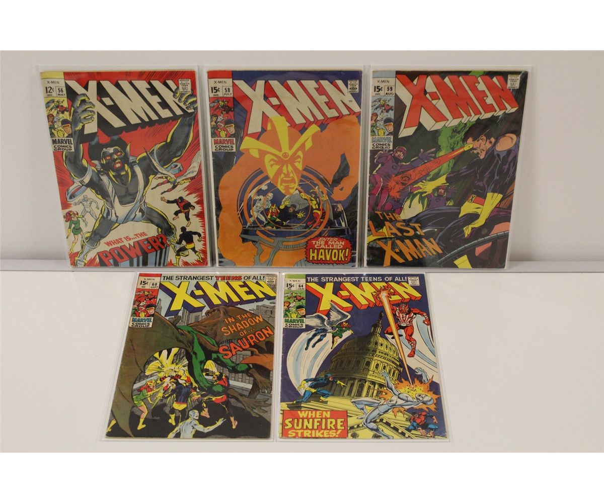 X-MEN #56, 58-60 & 64 (1969-70) SILVER AGE RUN OF BARRY SMITH & NEAL ADAMS ART ISSUES! #58 - 1ST APP. HAVOK, #64 - 1ST APP. SUNFIRE. SHARP MID TO HIGH MID GRADE AVERAGE, GLOSSY, TIGHT & SUPPLE, VERY NICE RUN! 2013 OVERSTREET TOP END GUIDE VALUE OF OVER $1,200
