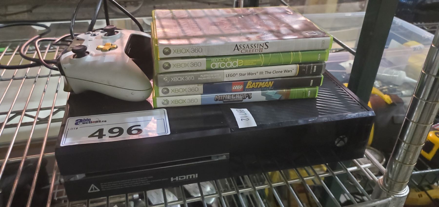 XBOX ONE WITH CONTROLLER, POWER CORD, HDMI CABLE, AND 5 GAMES