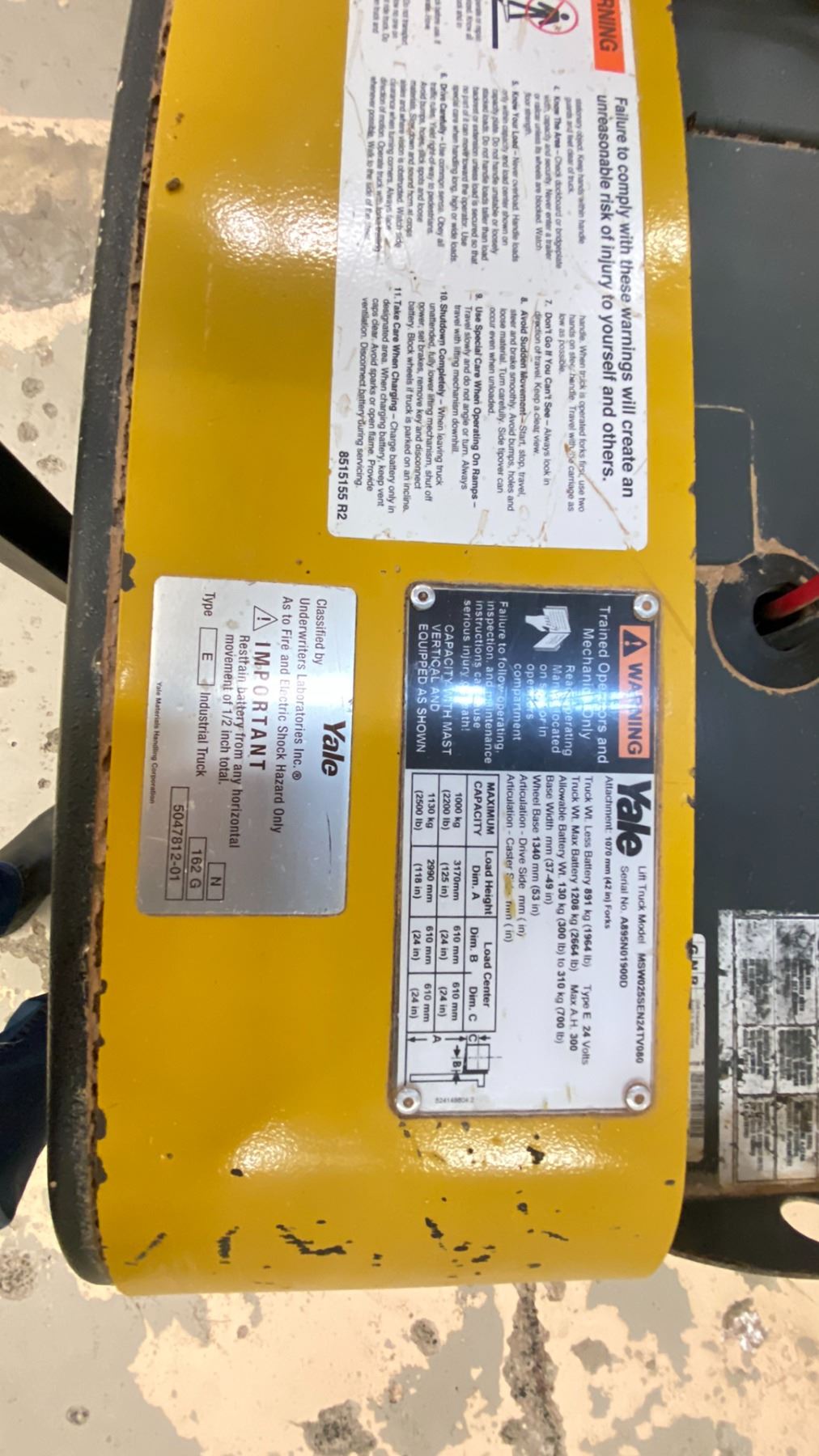 YALE MODEL MSW025SEN24TV080 MAX CAPACITY 1000 KG, LIFT RANGE 125" (10'5"), POWER PALLET LIFTER WITH CHARGER