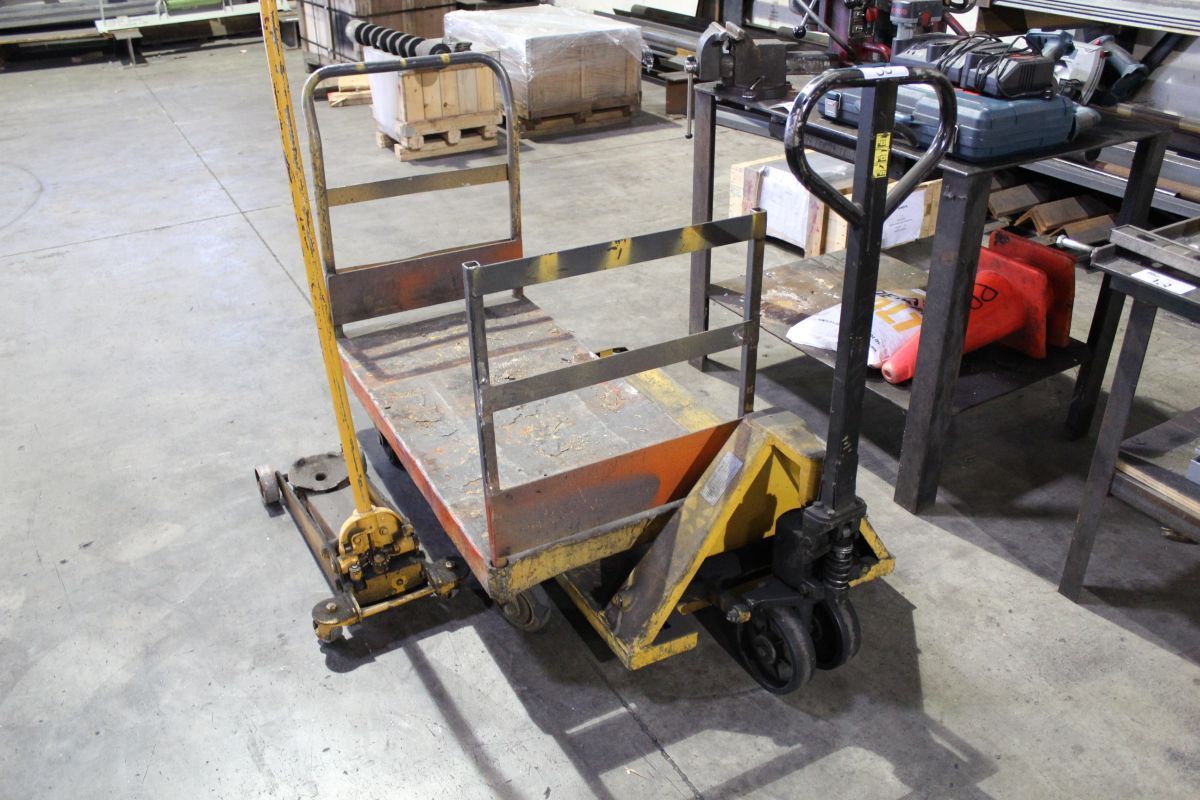 YELLOW 5000 LBS PALLET JACK, FLOOR JACK AND 2 METAL MOBILE CARTS